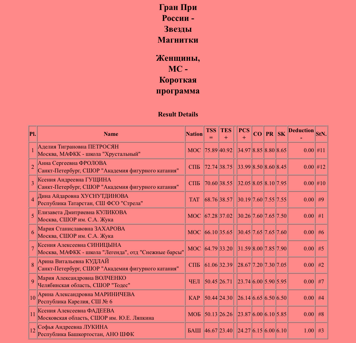 Поздравляю всех болельщиков фигурного катания и фигуристов со стартом взрослой серии Гран-при России. Первый этап проходит на арене «Металлург» в городе Магнитогорск. 🎤Турнир комментируют: Василий Соловьев, Михаил Коляда и Алексей Ягудин. Также на арене работают Максим Траньков и Евгения Медведева. Женщины открывали соревнования Выступала первой и отлично справилась с предстартовым волнением и своей программой. 3Lz+3T, 2A, 3Lo — всё аккуратно и чистенько! Очень хороший прокат 67.28, пятое место. У Арины зажигательная постановка под песню Sweet Dreams. С первых секунд зал аплодировал и поддерживал фигуристку. Это первый взрослый этап Гран-при в карьере фигуристки. 3Lz+3T, 2A, 3F. Визуально чисто. Судьи отметили неясное ребро на 3Lz и недокрут на тройном тулупе. Арина улыбалась после проката и была счастлива. 61.06, восьмое место. 3Lo, 2A, 3Lz+3T (упала 💔) Хорошая первая половина программы. На каскад заходила аккуратно, выезд с первого прыжка был не самым уверенным и второй прыжок п