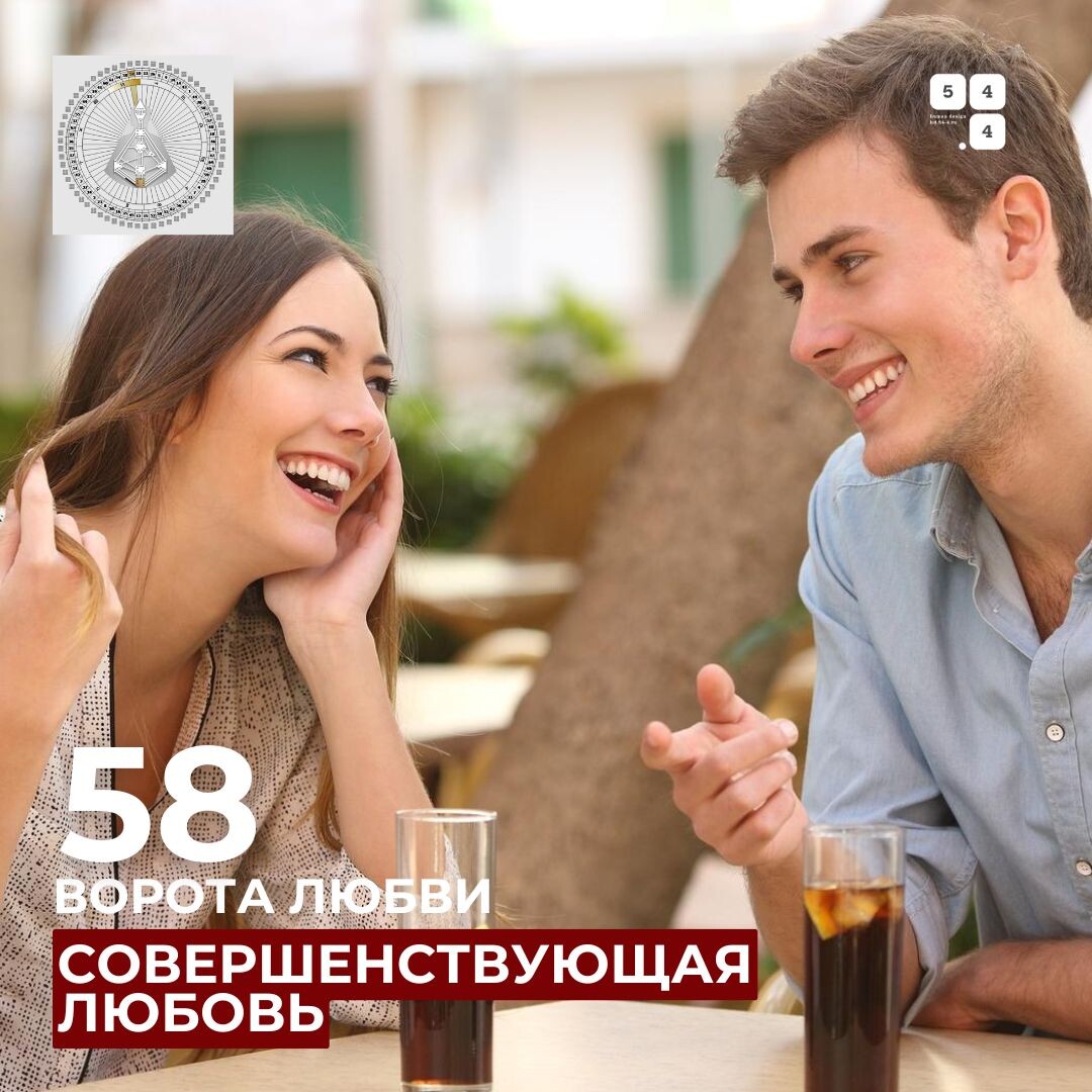 "Мы продолжаем наше путешествие по темам мирской любви в 58-х воротах. У них такое чудесное имя - Радость. Очень хорошее. Существуют всевозможные виды любви. Это – самая глубокая, глубочайшая память о любви, которую человечество несёт в себе. Посмотрите, на другой стороне канала находятся 18-е ворота, и это источник всякого вызова, а этот вызов – мать и отец. 18-е ворота – место матери и отца. Это место, где бросается вызов археТипам матери и отца, мужского и женского начала. 58-е ворота не имеют отношения к тому, чтобы найти совершенную любовь. Это может показаться потрясающим или ужасным, но ложное «Я» 58-х ворот создаёт, из исправления и вызова, совершенную любовь. "Ты мог бы стать любовником получше, дорогой. Давай, я расскажу тебе, как. Ты мог бы стать лучшим мужем или ты могла бы стать лучшей женой. Давай, я расскажу тебе, как, и позволь мне всё время тебе об этом рассказывать. А когда я всё время могу рассказывать тебе, как быть лучшим партнёром, я люблю тебя". Я так рад, что
