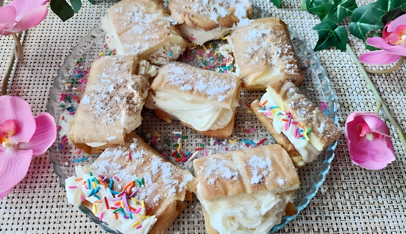 14. Полученные пирожные выкладываем на тарелку, посыпаем сахарной пудрой и украшаем по желанию — ягодами, натертым шоколадом или кондитерской посыпкой.