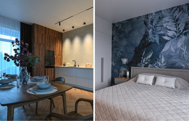 Спальня оформлена в насыщенной синей гамме, которая «звучит» во фреске с цветами и текстиле. Встроенный шкаф сливается со стеной, не перегружая интерьер. Он позволяет эффективно использовать пространство, сохраняя при этом чистоту линий и минималистичный стиль. Мягкое освещение дополняет обстановку и создает уютную гармоничную атмосферу.