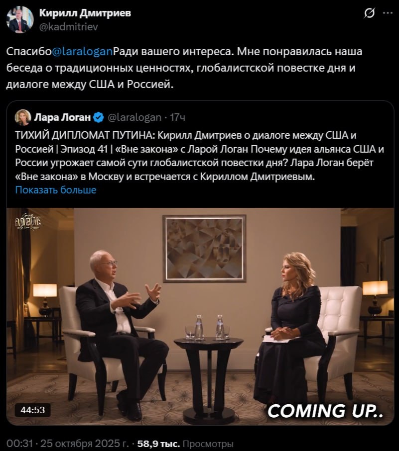 Кирилл Дмитриев развел бурную активность в США. Дал почти часовое интервью бывшей журналистке-международнце FOX News. Также дал небольшие интервью CNN и FOX News. Главный тезис России он озвучил: ВАШИНГТОН, 25 окт - РИА Новости. Глава РФПИ, спецпредставитель президента России по инвестиционно-экономическому сотрудничеству с зарубежными странами Кирилл Дмитриев заявил, что приближается окончательное разрешение украинского конфликта дипломатическим путем. "Я считаю, Россия, США и Украина близки к дипломатической договоренности", - заявил Дмитриев в интервью СNN. По его словам, прекращение огня на Украине не привело бы к разрешению ситуации само по себе. "Россия хочет не прекращения огня, но окончательного разрешения конфликта. Прекращение огня всегда может быть нарушено, это временное решение. Люди могут использовать его для перевооружения и подготовки к продолжению конфликта", - сказал Дмитриев. Как заявил он, стороны "разумно близки" к договоренности. Соответственно, никаких проры