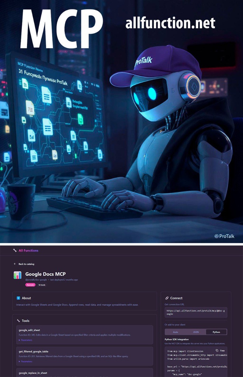 Скоро функции ProTalk будут доступны через MCP (Model Context Protocol) на домене allfunctions.net! Это значит, что вы можете использовать мощные возможности ProTalk в любом сервисе, который поддерживает MCP протокол.