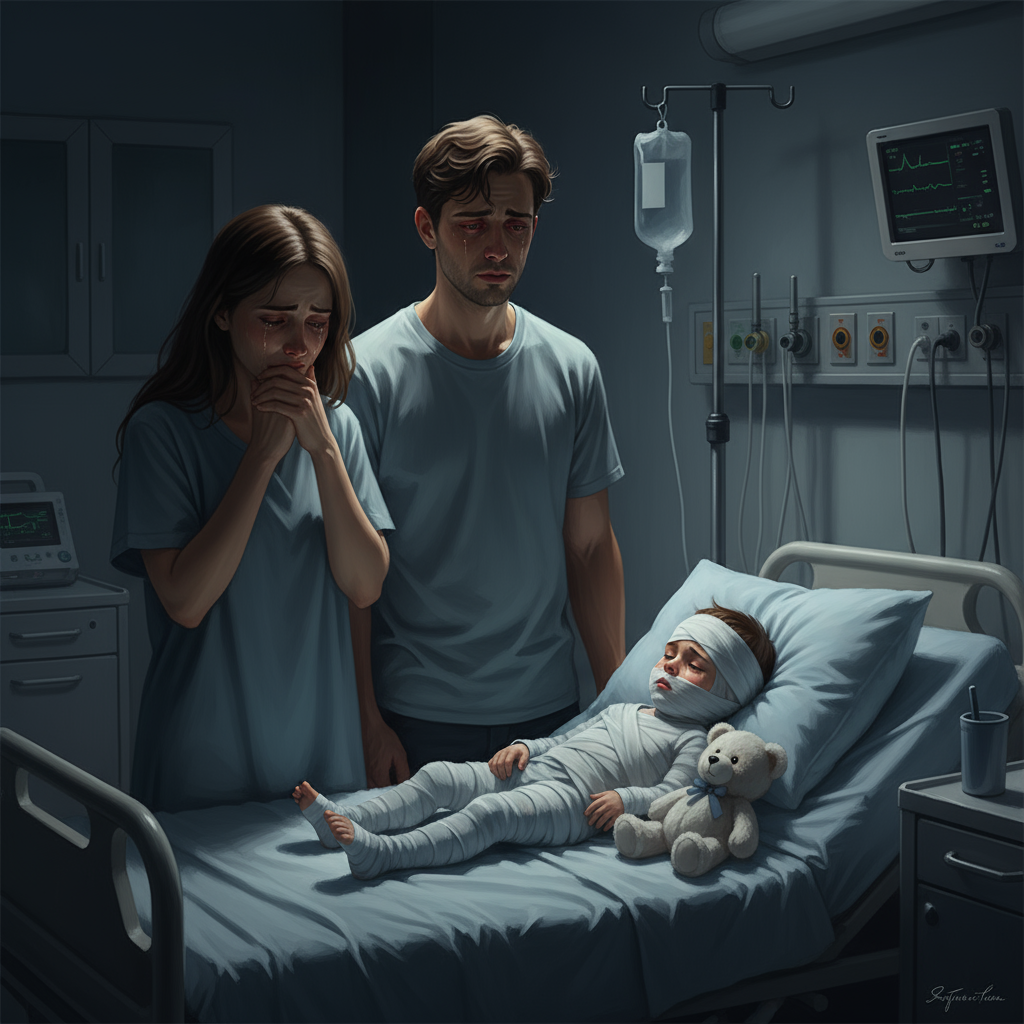 Через три дня муж заехал в магазин и купил того самого белого медвежонка. Они приехали в больницу рано утром. Врач разрешил зайти на минутку. Их сын лежал в бинтах, как маленький белый кокон, беззащитный и крохотный. Он открыл глаза, слабо улыбнулся и прошептал: «Мама… папа… домой…» Они положили рядом с ним мишку. «Это твой друг, сынок». Мальчик посмотрел на игрушку и слабой ручкой потянул ее к себе.