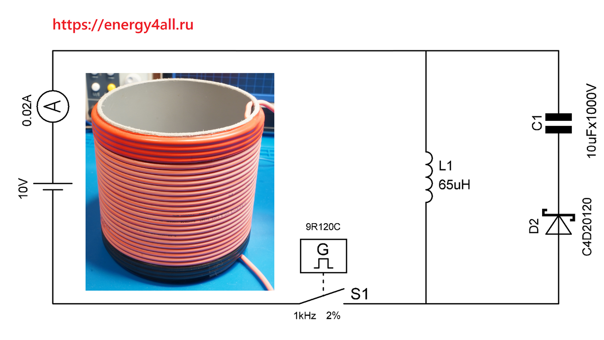 За-то становится понятно, откуда берётся неучтённая энергия, почему схема не работает с постоянно подключённой нагрузкой и полярными конденсаторами: импульс от источника тока сначала, как и положено, заряжает конденсатор, а потом уже индуктивность, но автор в своих расчётах этого не учитывает. После размыкания ключа конденсатор сливает свою энергию в катушку и перезаряжается через диод в обратную сторону - меняет полярность. Обычный LC-контур.