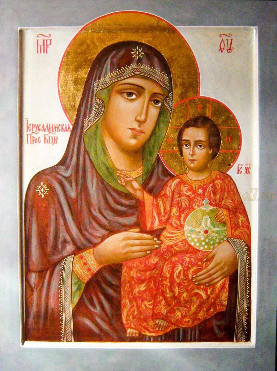 Икона Богородицы Иерусалимская Иерусалимская икона Божией Матери, по преданию, написана святым евангелистом Лукой в 15-й год после Вознесения Господа в Гефсимании (48). В 463 году образ был перенесен греческим царем Львом Великим в Константинополь. Во Влахернской церкви икона пребывала почти три сотни лет. Заступничеством Иерусалимской иконы Пресвятой Богородицы византийские войска отразили нападение скифов. В 988 году икона была принесена в Корсунь и подарена святому равноапостольному князю Владимиру. Когда новгородцы приняли христианство, святой Владимир отправил им этот образ. Иоанн Грозный в 1571 году перенес икону в Московский Успенский собор. После отечественной войны 1812 года древний Иерусалимский образ Богоматери исчез из Московского Кремля. Существовала легенда о том, что французские солдаты похитили святыню, увезли ее во Францию и установили в соборе Парижской Богоматери. Однако в 1977 году главный инспектор по памятникам истории Франции на запрос о судьбе Иерусалимского