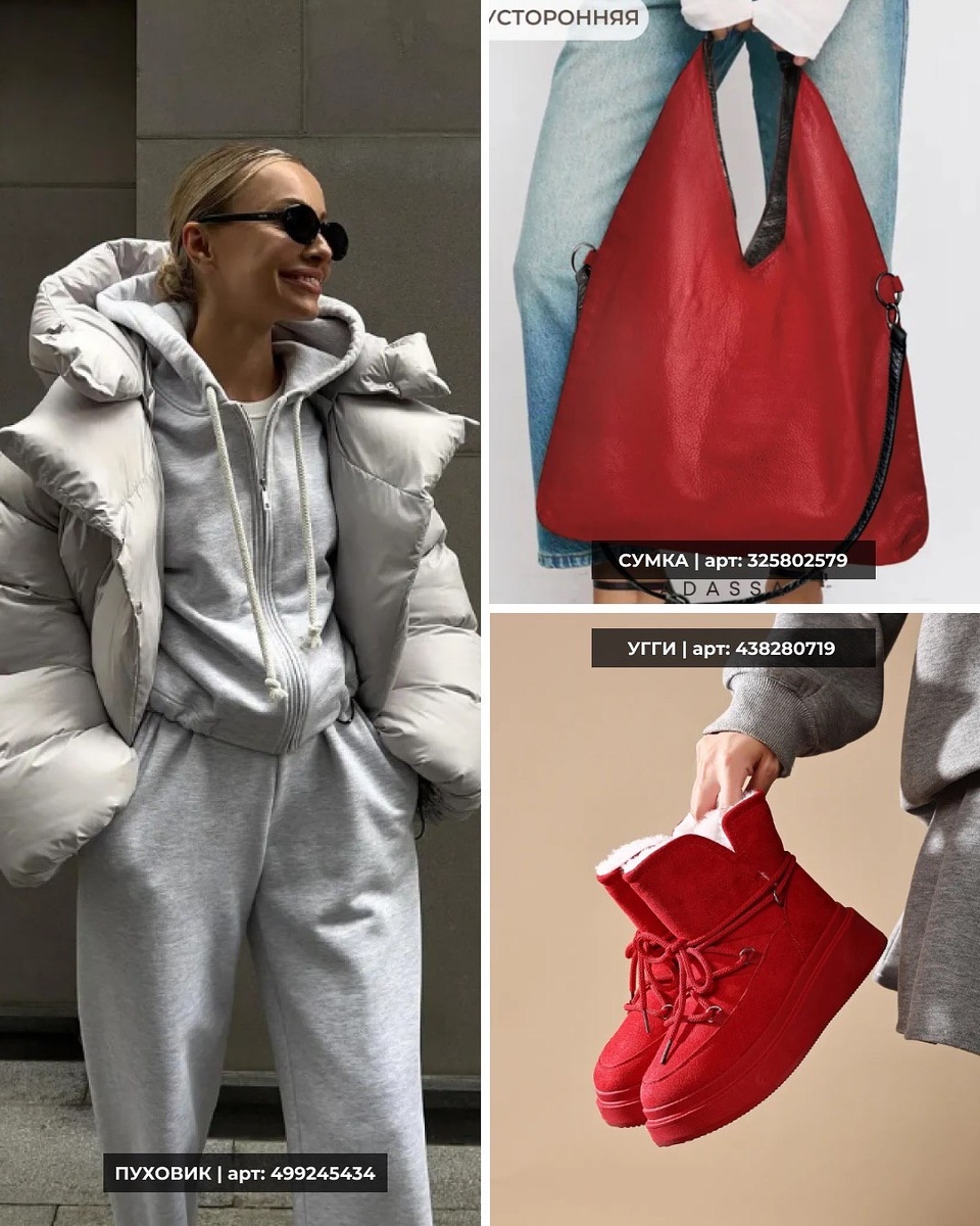- Светлый монохром с акцентом. Пуховик 499245434 + серый костюм из трикотажа + сумка 325802579 + угги 438280719.