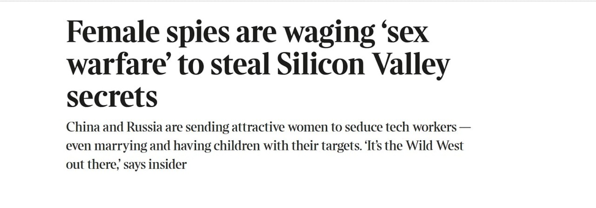 Оказывается, красивые девушки славянской наружности посещают конференции, митапы и прочие места притяжения айтишников в Кремниевой Долине😱😱😱. И после знакомства, которое иногда выливается в замужество, выпытывают инструментарием современных Мата Хари секреты фирмы. Это обходится американской экономике в миллионы долларов недополученной прибыли.