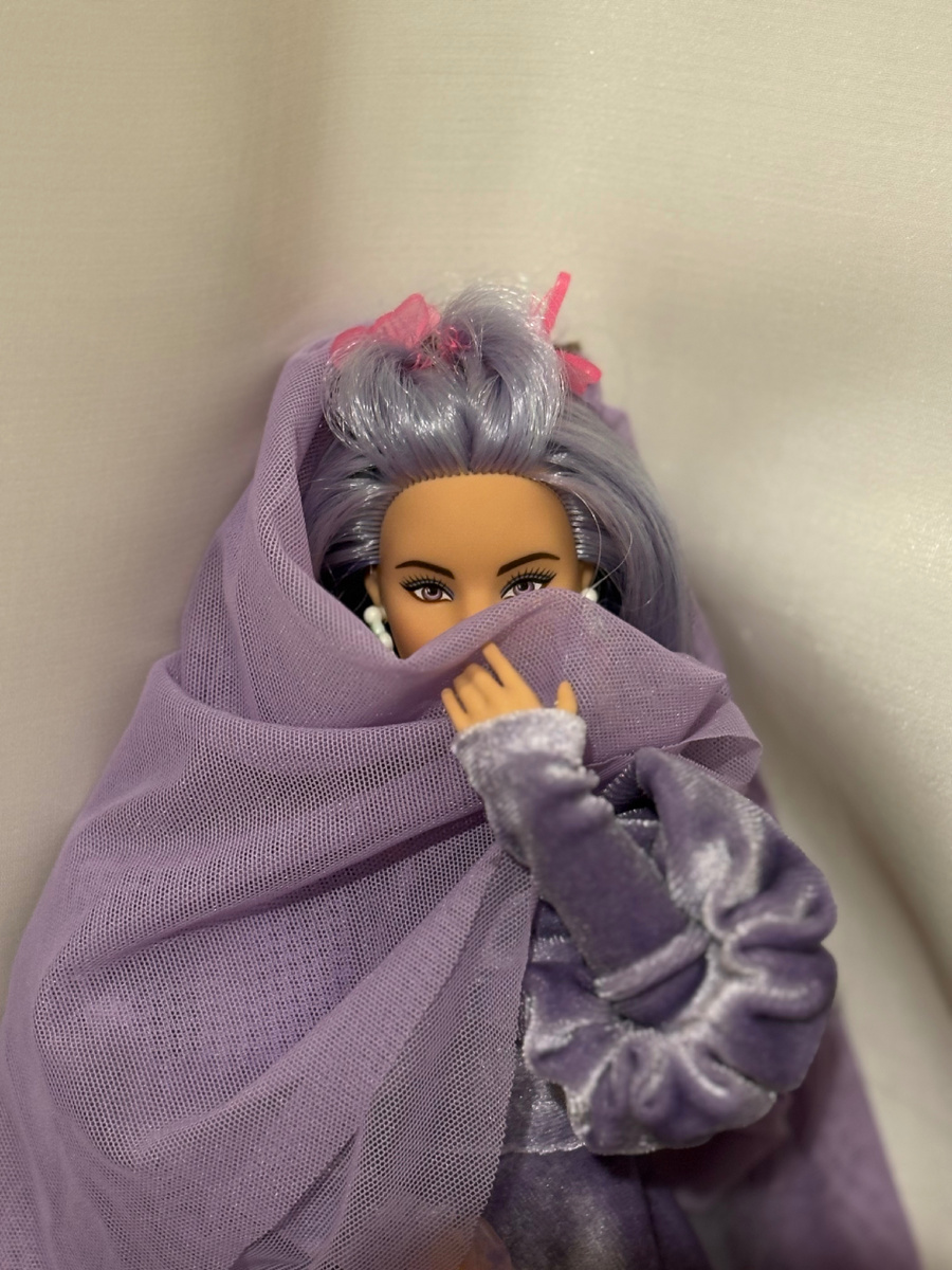 Один отличный канал @kukolki_moi объявил челлендж «Цветновласка», в котором надо показать свою куклу, у которой какой-то яркий, но неестественный цвет волос. Только прочитав эту статью, я тут же побежала фоткать куклу, потому что я уже точно знала, кого именно хочу представить в этом челлендже. И так, встречайте, вот она, загадочная цветноволосая красотка…. Вы уже поняли, кто это? Ну конечно, это Барби Экстра под номером 20. Эта сиренеглазка покорила меня сразу, как только вышла и я поспешила ее приобрести. Она долгое время стояла у меня на полке в своем первозданном виде. Мне казалось, что ее наряд идеально ей подходит. Один раз только решилась раздеть ее для темы «Куклы только в цветах». Ну а сейчас я поняла, что челлендж «Цветновласка» - отличный повод, чтобы ее переодеть. У меня как раз лежало сиреневое платье с фатой в цвет. Кажется, это еще один наряд, который просто создан для Экстры 20. Единственное, мне не удалось вынуть сережки из ее ушей, они со стопперами, а значит, ч