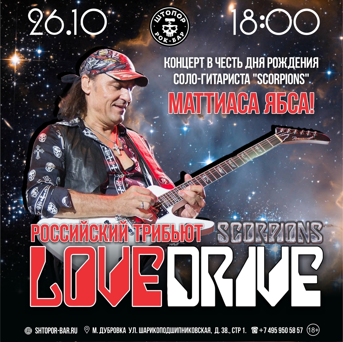 25 октября соло-гитаристу "Scorpions" Маттиасу Ябсу исполняется 70 лет! В честь этого на следующий день, 26 октября, группа "Lovedrive", российский трибьют "Scorpions", играет концерт в рок-баре "Штопор"! Адрес рок-бара "Штопор" - Москва, ул. Шарикоподшипниковская, 38 стр. 1 (м. Дубровка) Сайт - https://shtopor-bar.ru/ Билеты от 800 р. Заказ столиков +7 (495) 950-58-57