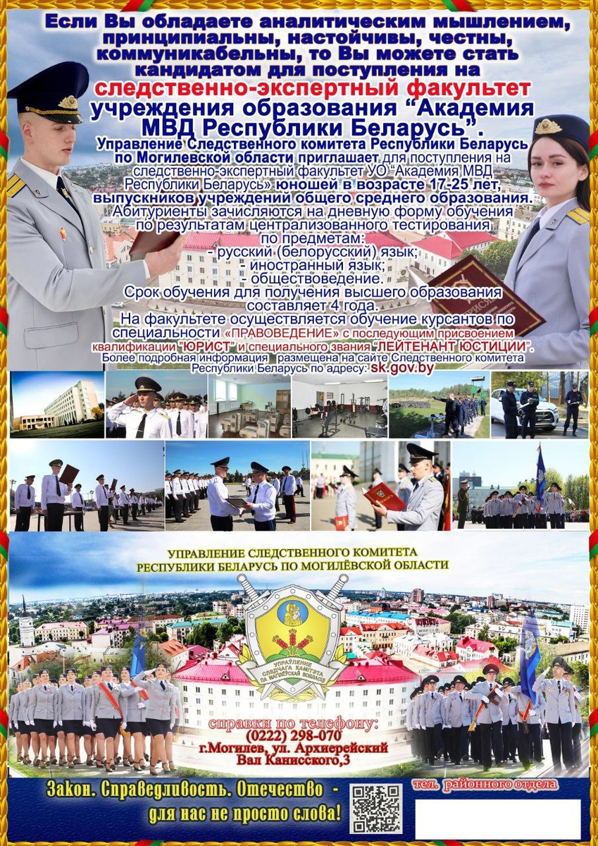🎓 Следственно-экспертный факультет Академии МВД Республики Беларусь. Если ты обладаешь аналитическим мышлением, принципиален, настойчив, честен и коммуникабелен - ты можешь стать кандидатом на обучение в Академии МВД по специальной программе! 📚 Факультет готовит специалистов для следственных подразделений; Следственного комитета Республики Беларусь; органов внутренних дел; Государственного комитета судебных экспертиз. А также преподавателей учреждений образования, готовящих кадры для правоохранительных органов 📌 Форма обучения - очная. 📆 Срок обучения - 4 года. 🎓 Квалификация по окончании - «юрист». ✅ Обучение - за счет республиканского бюджета; ✅ гарантировано трудоустройство в правоохранительных органах. 📌 Контакты Шкловского районного отдела Следственного комитета: 📞 8-02239-97400 - общий номер; 📞 80293073411 - начальник отдела Проходский Александр Александрович; 📞 802239-97355 - приемная.