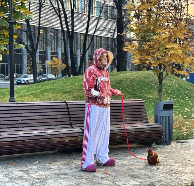 🐓 Иван Марголдин из группы ПОЛМАТЕРИ с утра пораньше выгуливает на поводке курицу