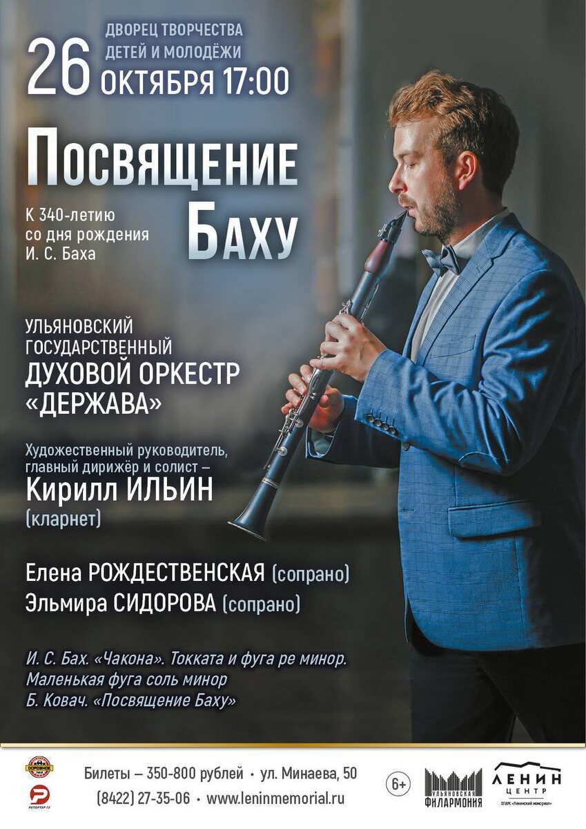 Посвящение Баху 🗓️ 26 октября в 17:00 📍Дворец творчества детей и молодёжи В программе – уникальные аранжировки произведений И. С. Баха для духового оркестра, а также для солиста и духового оркестра, созданные Кириллом Ильиным: Иоганн Себастьян Бах «Чакона». Токката и фуга ре минор. Маленькая фуга соль минор Белла Ковач. «Посвящение Баху» Подробности и билеты 🎟️ Для вас действует скидка 10% по промокоду культура 💝 #26октября25@culturnik