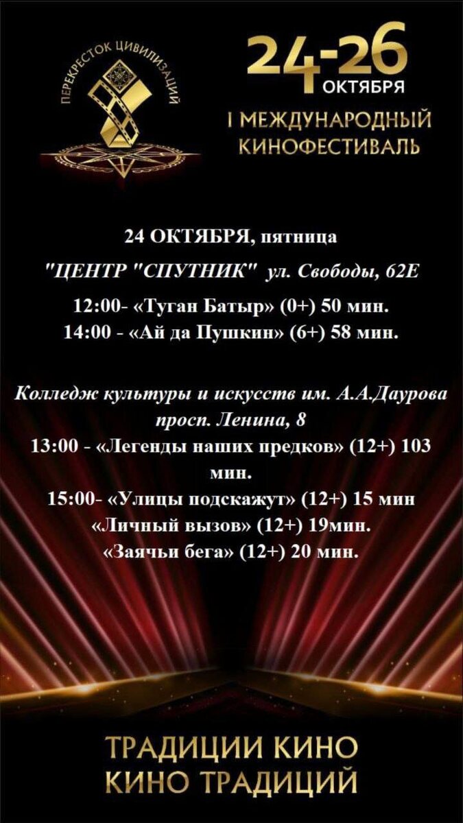 В Карачаево-Черкесии проходит первый в ее истории международный кинофестиваль 〽️Международный кинофестиваль «Перекресток цивилизаций» проходит в нашей республике с 24 по 26 октября. На суд жюри были представлены 155 картин-претендентов от участников из 13 уголков планеты. ⏺️Из них были отобраны лишь 16 самых ярких работ. Их ждет решающая битва за статуэтку фестиваля