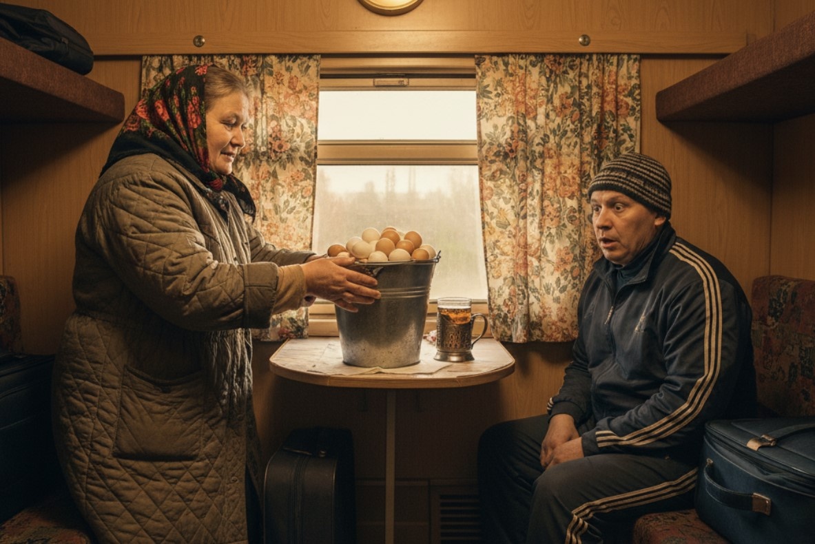 К утру женщина выглядела так, будто сама прокатилась в ведре вместе с яйцами: смятая, уставшая, злость испарилась, осталась только обида и стыд. На станции она вышла первой, даже не взглянув в сторону купе.