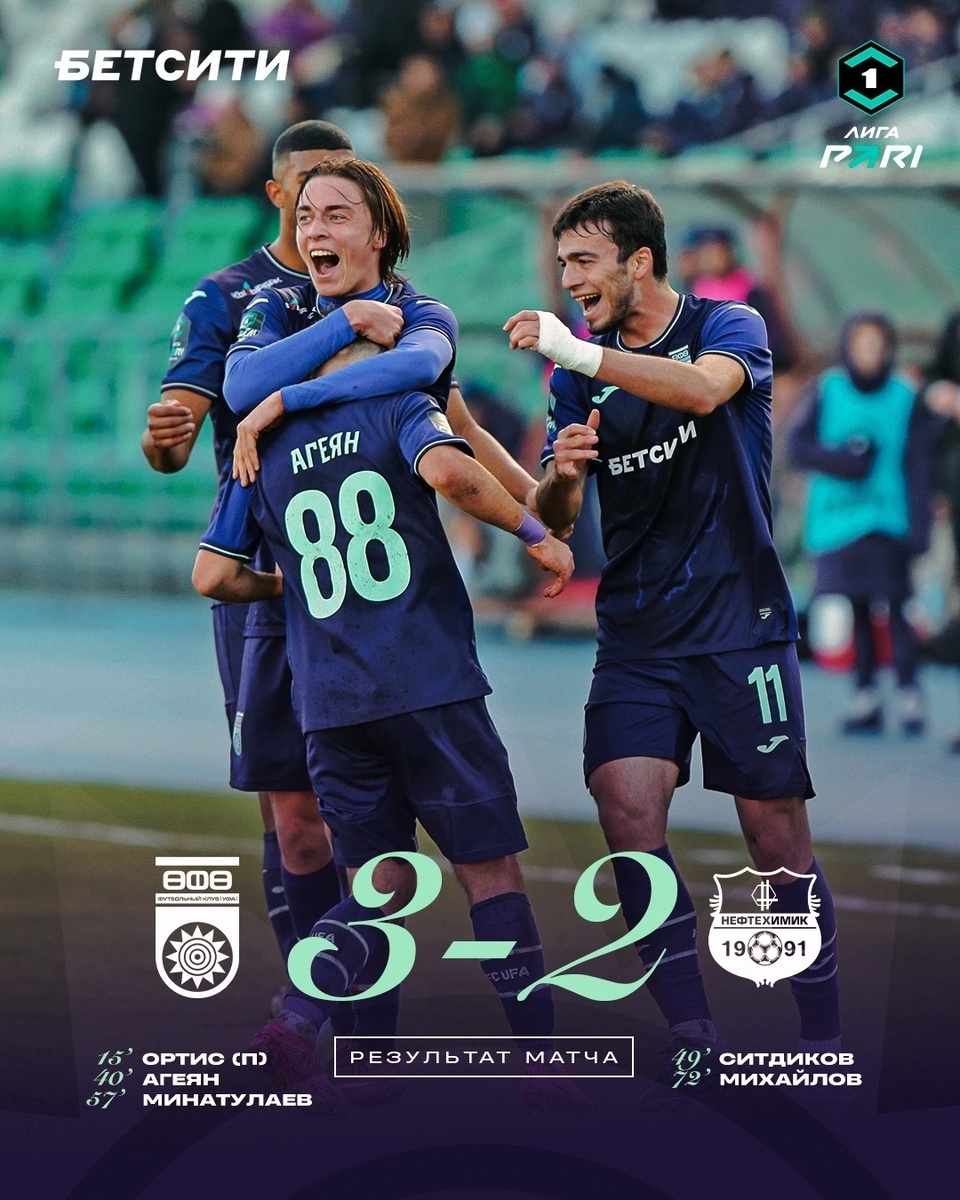 Со счетом 3:2 в пользу футбольного клуба «Уфа» завершился матч с командой «Нефтехимик» из Татарстана. На 15-й минуте удачное пенальти совершил Дилан Ортис (пенальти), на 40-й гол забил Мигран Агеян, а на 57-й победу «уфимцам» принес Осман Минатулаев. Ранее ФК «Уфа» посвятил победу над «Енисеем» Башкирии и её жителям.