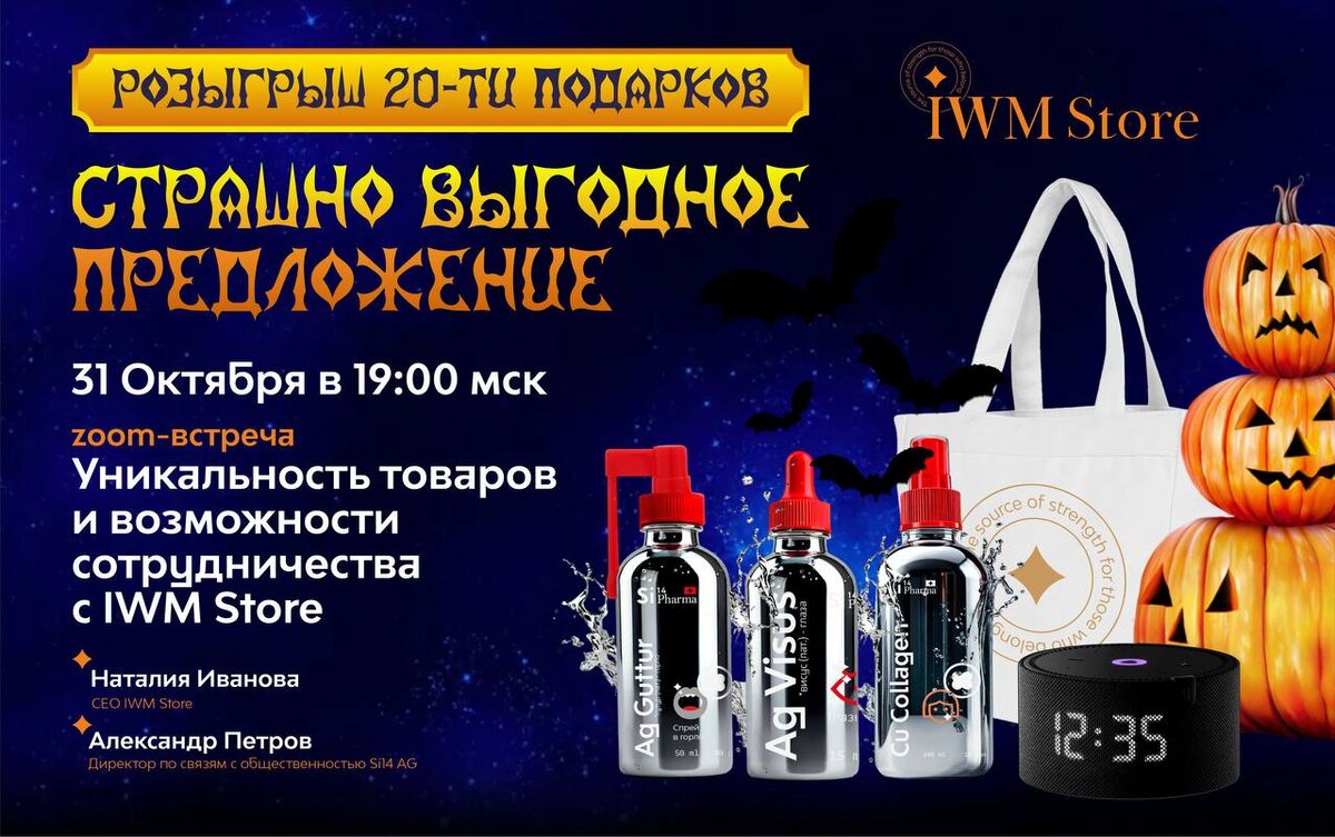 🔥Страшно выгодно быть с IWM Store🔥 В этот Хэллоуин ничего не бойся! 😈 Закажи продукцию, участвуй в розыгрыше и получай призы! 31 октября, 19:00 (Пятница) - Мы готовим для вас магический эфир от IWM Store! Пока кто-то охотится за тыквами, мы охотимся за энергией и здоровьем! Магний против усталости, Цинк против вирусов, Медь — против стресса, Серебро — за иммунитет. Настоящая алхимия здоровья и бизнеса от IWM Store! Наши проводники в мир магии и возможностей: ✨ Иванова Наталья ✨ Петров Александр 🎁 Большой розыгрыш подарков! ✅20 призов 1 шт. Годовой запас Mg 30 ppm (100мл) - 12 шт 1 шт. Годовой запас Zn 30ppm (100мл)) - 12 шт 1 шт. Годовой запас Spirulina Powder (140 гр) - 12 шт 1 шт. Набор «Beauty & Glow» 1 шт. Набор "Detox Balance" 1 шт. Набор «Anti-stress» 1 шт. Набор "Immuno Guard" Набор для красоты и здоровья- 2 шт, в состав набора входит: Cu Collagen (100 мл) Ag Sanatio (100мл) Ag Visus (15 мл) Ag Gutur (50мл) Mg 30 ppm (100мл) Zn 30ppm (100мл) Cu Collag