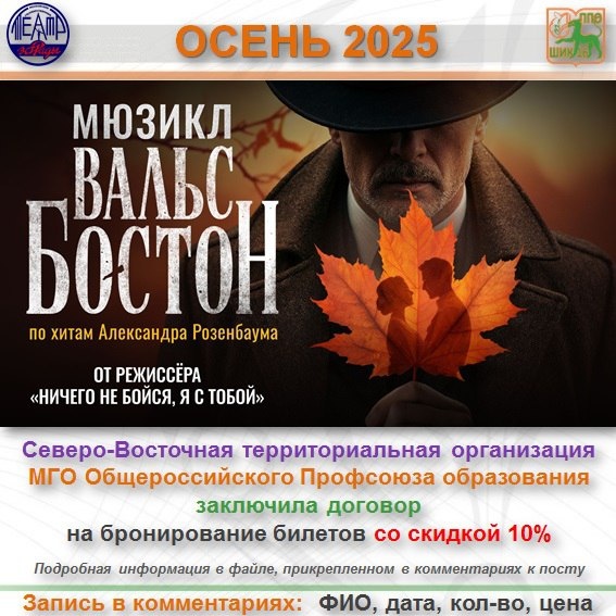 Уважаемые ШИКарные коллеги! 🕺В театре Эстрады с сентября 2025 года премьера мюзикла 🍁 «Вальс Бостон» по хитам Александра Розенбаума Северо-Восточная территориальная организация МГО Общероссийского Профсоюза образования заключила договор на бронирование билетов со скидкой 10%. Продолжаем сбор заявок (по ценовой категории места и ряды негарантируем) ‼Сегодня в наличии есть 2 билета в 3 ряд места 13,14 цена со скидкой 7560₽ (3780₽+3780₽) 📎 Подробная информация в файле, прикрепленном в комментариях к посту