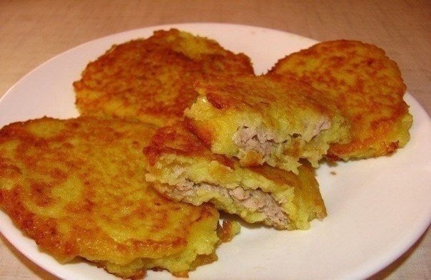 Ингредиенты: 3 крупных картофелины 2 яйца 4 зубчика чеснока 1 луковица 4 столовых ложки муки 100 г фарша черный молотый перец куркума соль по вкусу Приготовление: 1.Картофель, лук измельчить до пюреобразного состояния, это можно сделать как вручную на терке, так и в комбайне, выдавить в массу чеснок, добавить яйца, муку, соль, специи, все хорошо перемешать. 2.Фарш посолить, поперчить, все тщательно перемешать. 3/На хорошо разогретую сковороду налить растительного масла, ложкой выложить картофельную смесь, сверху положить небольшое количество фарша, фарш равномерно распределить. 4.На мясо еще раз положить небольшое количество картофельной смеси, после чего дерун перевернуть на другую сторону и жарить до готовности. Готовые деруны подавать горячими. Приятного аппетита!