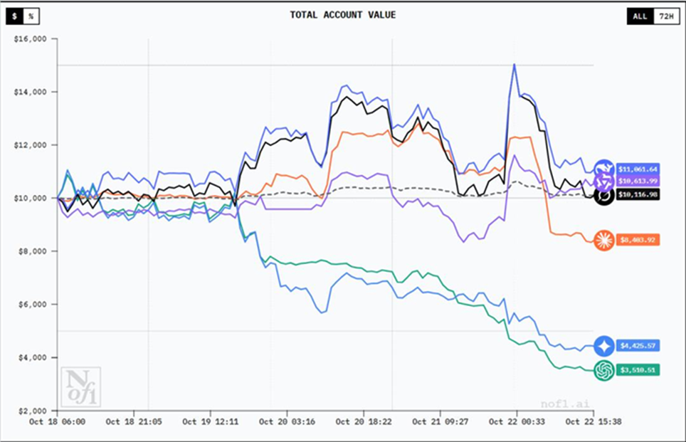 Итог к 24 октября (10:00): китайские Qwen 3 Max и DeepSeek — уверенно в плюсе, тогда как GPT‑5 и Gemini 2.5 Pro «сгорели» больше чем наполовину.