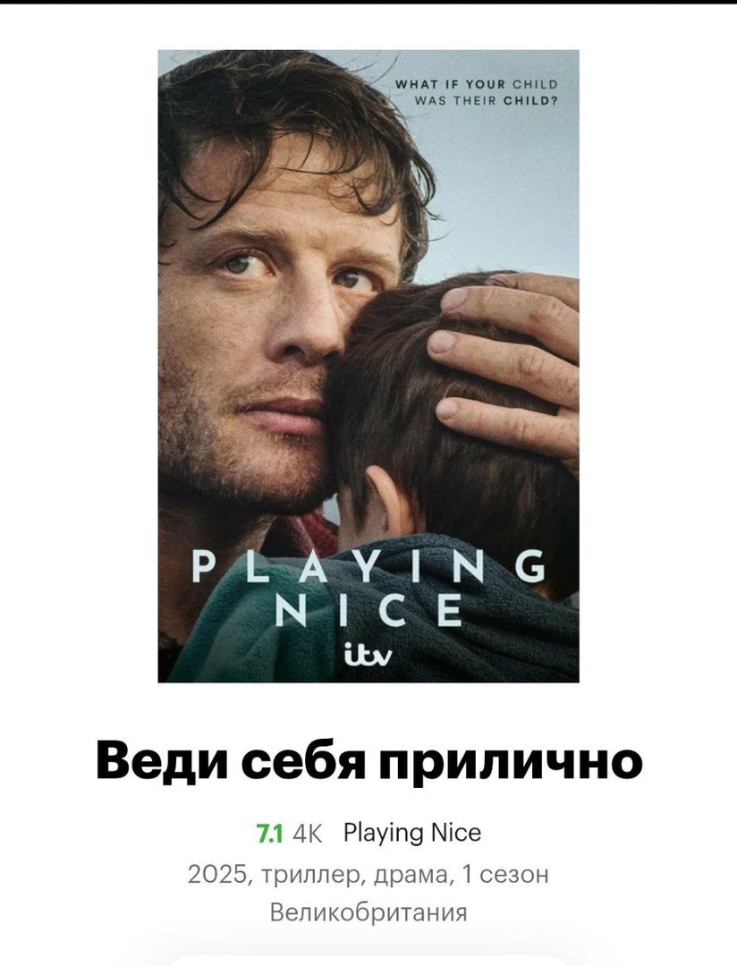 Что посмотреть, когда мозг требует "выключиться и н о чем не думать, кроме происходящего" Есть сериал. 4 серии. Всего. Сюжет: Двум семьям говорят: ваших детей перепутали в роддоме. Вы думаете: Сейчас будут судиться. А они решают: Подружимся. Будем делить детей. Все будут счастливы. Спойлер: Не будут. Потому что один из отцов — а не скажу. Название: "Веди себя прилично" (Playing Nice) Это не про "ах, как трогательно". Это триллер. Где каждая серия — это "боже, он ЭТО сделал?!" Можно было бы уместить в один фильм? Наверное. Но сейчас так редко делают. (Хотя у меня есть отличный фильмец на одну порцию — про него на следующие выходные) Смотрели? Пишите, как вам. Ну и лайки приветствуются, если мои рекомендации топ😉