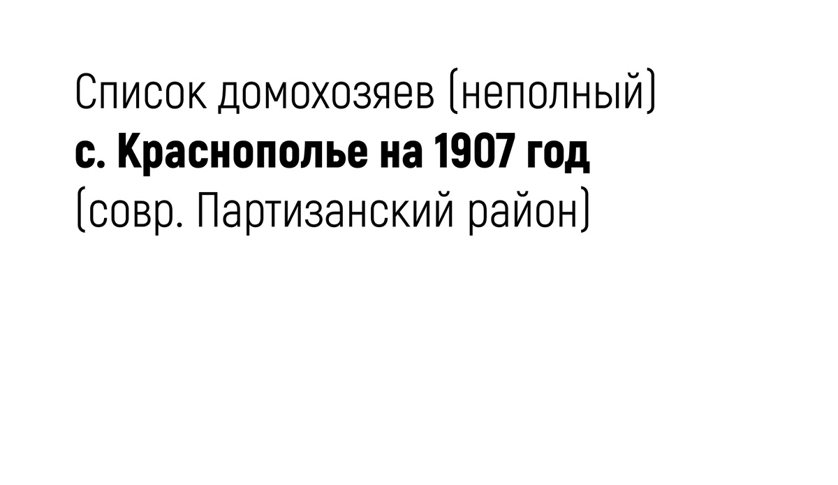 Всего 22 домохозяина из 35 имеющихся. Список домохозяев указан в документе «Дело Приморского областного по крестьянским делам Присутствия об образовании селения «Краснополье» в районе Сучанской волости» от 22 сентября 1907 года. Село основано в 1907 году, закрыто в 1950 году. Источник: