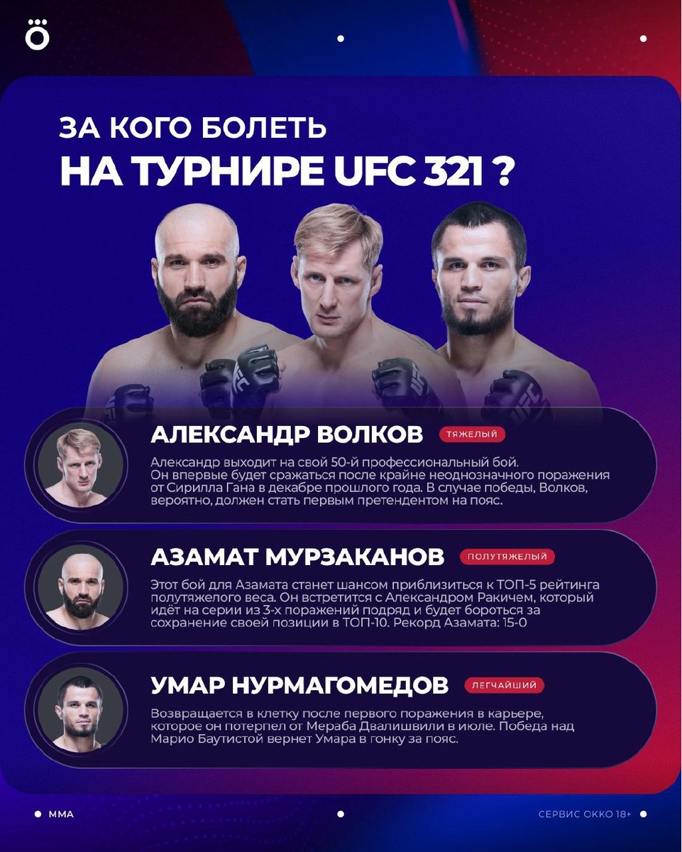 UFC 321 – одно из центральных событий мира единоборств в этом месяце. Помимо российских спортсменов на турнире нас ждет 2 боя за титул: поединок в тяжелом весе между Томом Аспиналлом и Сирилом Ганом, а также за вакантный пояс в женском минимальном весе между Вирной Жандиробой и Маккензи Дёрн. 🥊 Смотри прямой эфир UFC 25 октября в 21:00 на телеканале МАТЧ! в Okko: okko.tv/s/ujv
