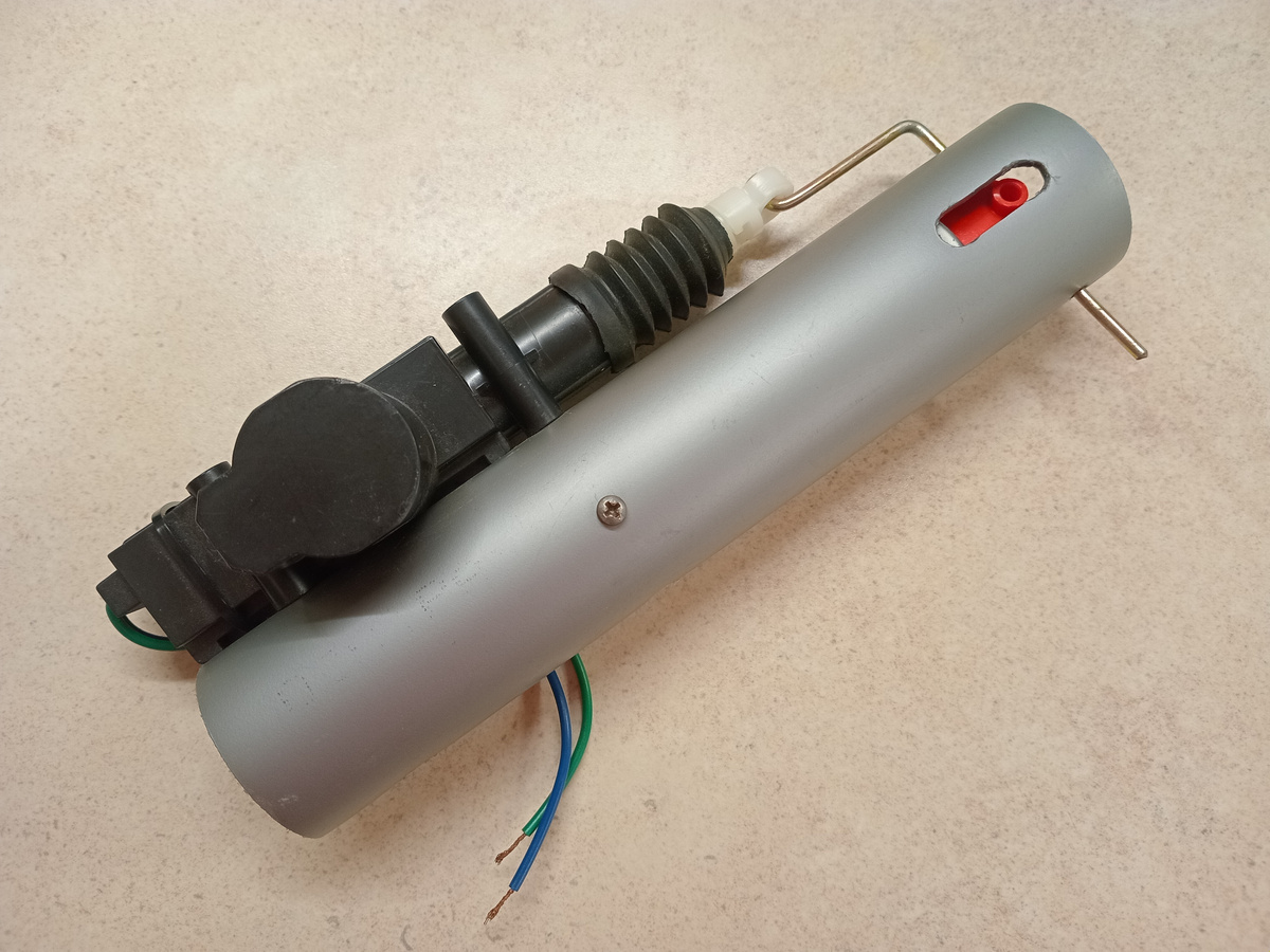 Если в какую-либо охранную систему (автомобиля, квартиры или дачи) параллельно реле, включающему блокировку, замок или сирену, подключить устройство распыления слезоточивого газа, уровень защиты резко возрастет... Безусловно, такая система потребует особой внимательности при ее эксплуатации, чтобы самому не попасть под "сюрприз". Но в ряде случаев оно того стоит и даже необходимо. Делается распылитель очень просто, на основе куска пластиковой трубы и автомобильного 12-вольтового дверного актуатора. Прикручиваем к трубе актуатор. Выглядит это примерно так: Кроме размеров трубы никаких иных размеров я не даю - все делается по месту, ибо работа крайне простая. Бывают разные актуаторы, разные газовые баллончики - всех размеров не предусмотришь, и точные чертежи тут не нужны. Примерно на середине трубы нужно сделать упорную площадку для газового баллончика. Я вставил подходящую пробку от банки каких-то витаминов и закрепил тремя саморезами. Но достаточно даже перемычки поперек трубы и