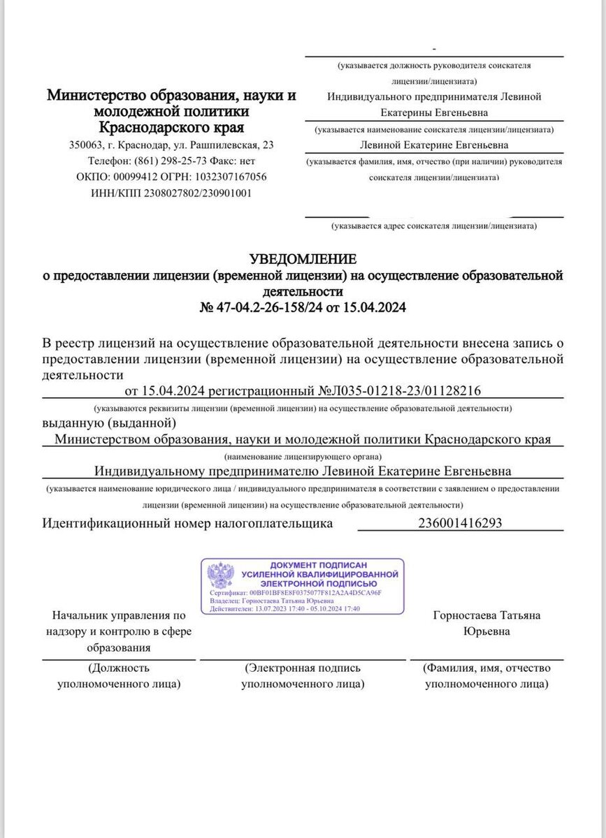 ⬇️ Не все знают, но наше обучение уже с весны 2024 года имеет официальную лицензию на образовательную деятельность ✅ Это серьёзное достижение, которое подтверждает качество, надёжность и высокий уровень проекта. 💪 Горжусь быть частью этого проекта и видеть, как мы растём и двигаемся вперёд! Присоединяйтесь — у нас всё по-настоящему 💛 P.S Екатерина, это основатель проекта