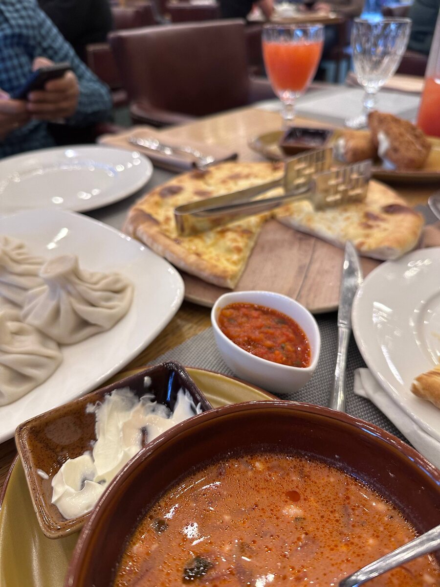 Арианна чувствует себя сегодня хорошо, никакой температуры нет 🤷♀️ Поэтому муж вывел нас сегодня в люди в ресторан. Вот почему-то на хинкали и хачапури у меня токсикоз не распространяется 😄 Мне все очень вкусно! Арианна тоже грузинскую кухню приветствует)) Заказала ей борщ и ела его сама, пока она уплетала мои хинкали