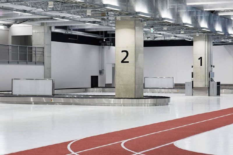 Токийский аэропорт с беговой дорожкой Идеально для тех, кто вечно опаздывает и потом бежит. Третий терминал в аэропорту Нарита реально выглядит как стадион: никаких движущихся лент и указателей — только синие и красные полосы. Первая ведёт к зоне вылета, вторая — к зоне прилёта. Надо в метро так сделать, будет топ. НА ШУМЕ