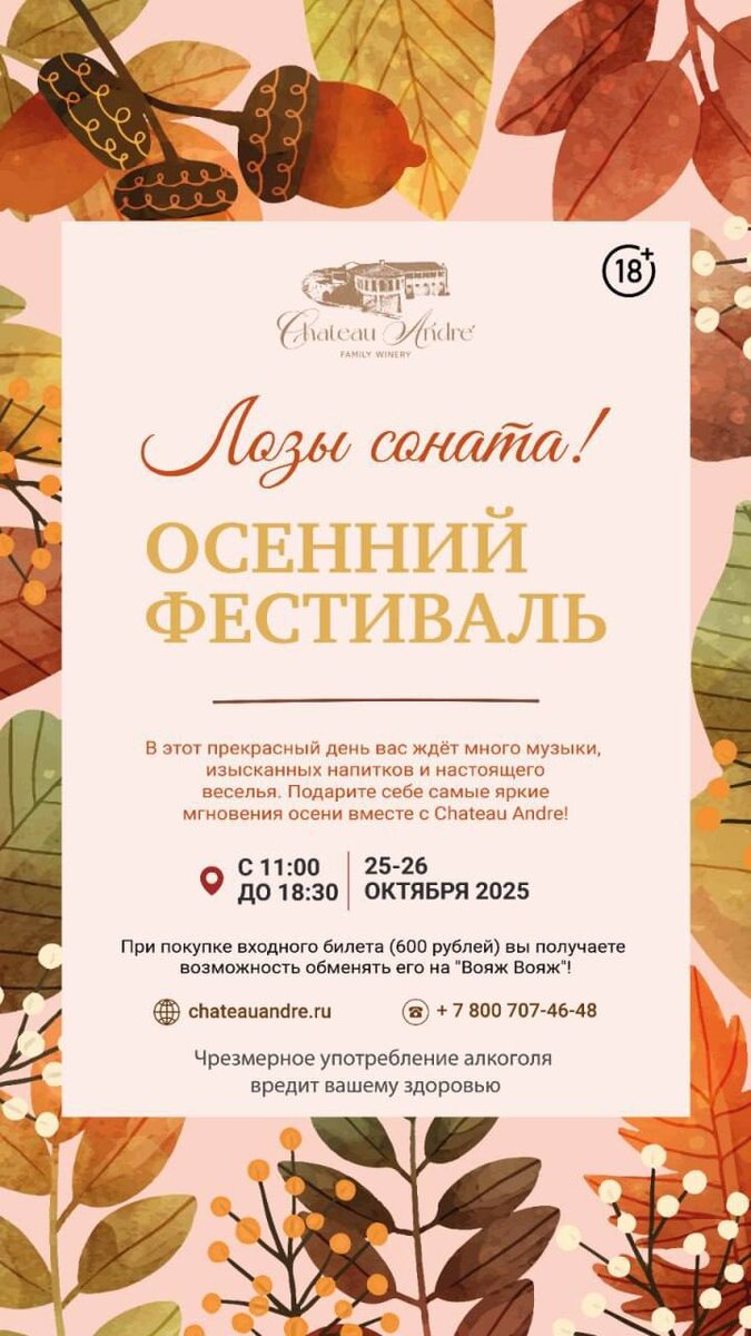 🍇В семейной винодельне «Шато Андре» Крымского района проходит двухдневный осенний фестиваль «Лозы соната» Гостей ждут мастер-классы, творческие выступления солистов и коллективов, забег по виноградникам, вкусные блюда из фермерских продуктов и, конечно, – вино. 📍Крымский район, хутор Школьный, ул. Магистральная, 12 Видео: «Шато Андре»