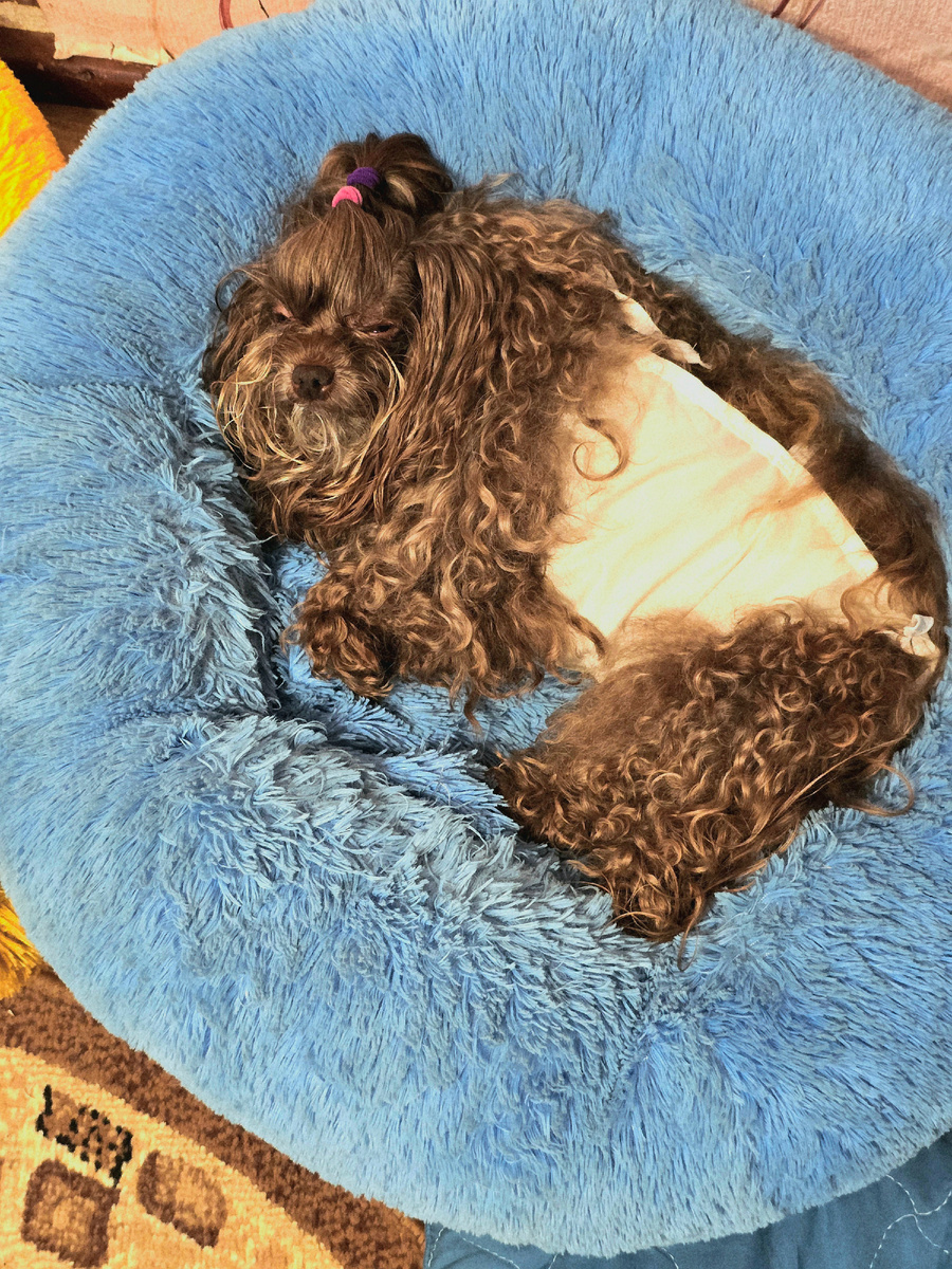 К сожалению, мои девочки с возрастом всё тяжелее переносят наркоз. В первый день Аля была сильно заторможенная, вялая, старалась сидеть, а не ложиться, видно было, что ей больно двигаться, но поела с аппетитом, попила, и я успокоилась. Категорически не хотела гулять... Я бы оставила её дома, но она будет терпеть полночи, пока решится сходить на пелёнку. Все мои собаки приучены делать свои дела на улице, мы гуляем 2 раза в день в любую погоду. И переломить эту многолетнюю привычку болонкам тяжело, особенно Алечке, она у меня самая ответственная. Но на улице, на удивление, Аля приободрилась, оживилась, начала нюхаться! Сердце радовалось! По лестнице туда и обратно я несла ее на руках, что тоже являлось непростой задачей, так как швы и на боку, и на животе. Следующее утро началось с традиционного выпрашивания вкусняшки, Аля принимала активное участие, двигалась намного легче! Я начала испытывать робкую надежду, что всё закончится хорошо..