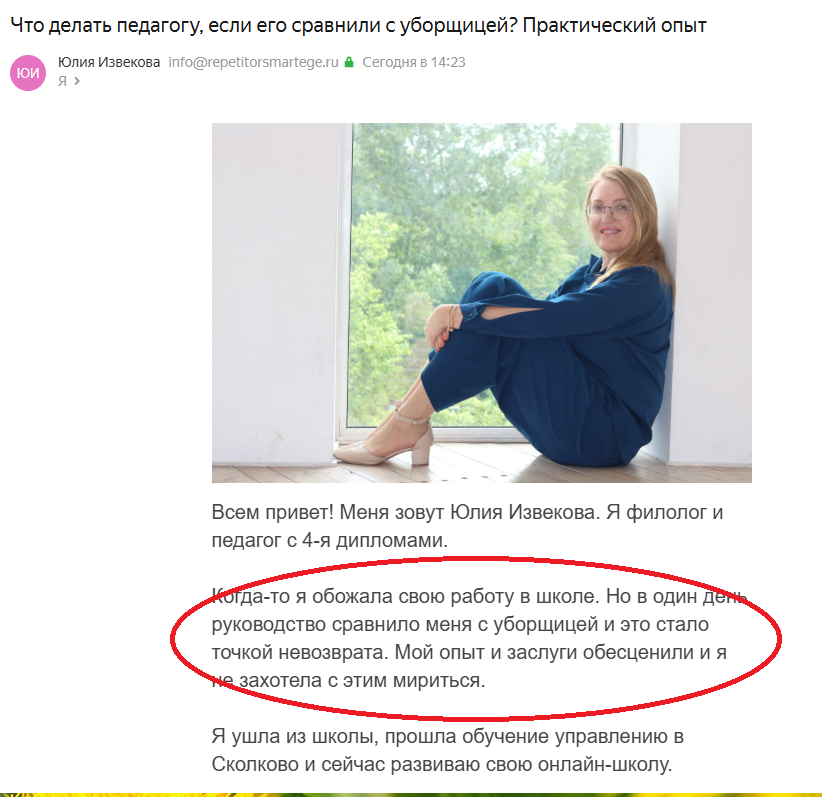 Очередной перл прислала мне некая Юлия Извекова. Тема письма меня сразу огорошила "Что делать педагогу, если его сравнили с уборщицей? Продолжать учить? Практический опыт." - Бред какой-то подумала я, и оказалась права. Дальше меня познакомили с драматической историей филолога и педагога с 4 дипломами. Причем ни один диплом филолога не помешал ей с легкостью пропустить несколько запятых. Ну так вот, когда-то Пишет наша филолог я обожала свою работу в школе. Но в один день руководство сравнило меня с уборщицей, ми это стало точкой невозврата. Ну наверное, директор, такая сказала: "Юлия, даже наша уборщица знает, что части сложного предложения отделяются от друг от друга запятой, а вы все-таки филолог". Видимо, Юлия считает, что уборщица делает, что-то совершенно неважное, в отличие, от нее, от Юлии с 4 дипломами. Юлию Извекову с уборщицей сравнивать нельзя, (а со строителем, интересно, можно?) Тут же Юлия взяла обесцененные опыт и заслуги с собой и пошла учиться в Сколково. С
