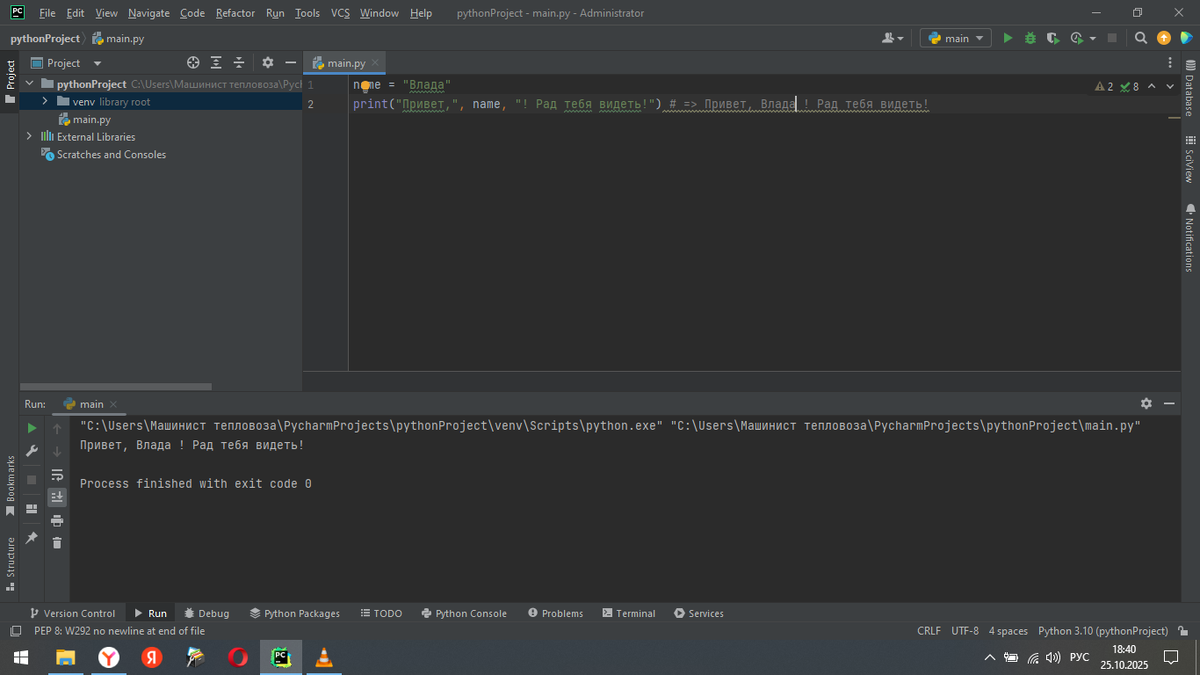 Приветствую, будущий повелитель битов и байтов! Сегодня мы поговорим о двух китах, на которых держится любой разговор с "Python": функциях "print()" и "input()". "print()" нужна для того, чтобы "Python" что-то вам сказал, а input()" для того, чтобы вы могли что-то ему ответить. Звучит просто? Спойлер: не совсем. Но будет весело, обещаю! (или нет, как пойдет). print() – это как рупор. Вы ей что-то говорите, а она громко (точнее, на экране) это выводит. Куда? В консоль, конечно! Это такое чёрненькое окошечко, где раньше сидели хакеры, а теперь – вы. Обратите внимание: "print()" умеет принимать несколько аргументов, разделённых запятыми. Он их аккуратно склеивает (с пробелами между ними) и выводит на экран. Очень удобно, если вы хотите вывести сообщение, состоящее из текста и переменных. Можно, конечно, извратиться и сделать вот так: Но зачем, когда есть более элегантный способ? Правильно, незачем. Но иногда (очень-очень редко) это может пригодиться. Но что делать, если нам нужно более то