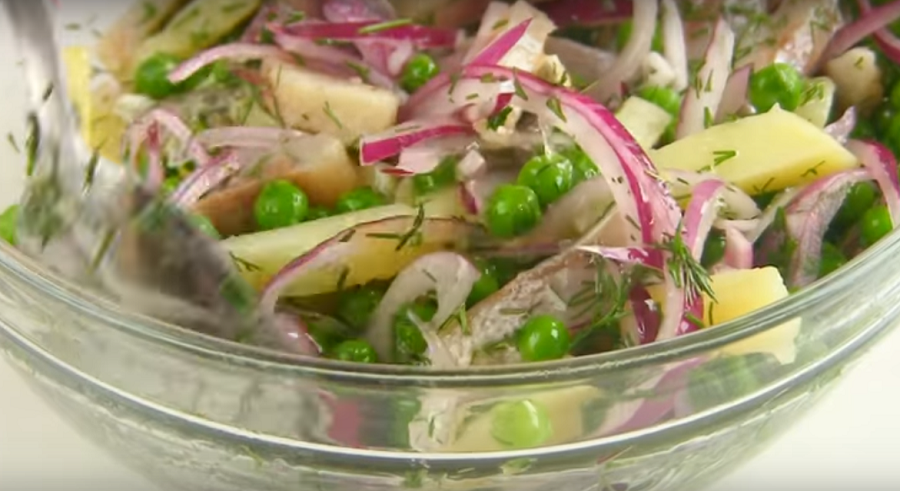 Этот простой салат станет отличным дополнением праздничного стола или сытным перекусом в будни. Его нежный вкус удачно сочетается с насыщенным ароматом специй и свежестью овощей. Ингредиенты: Картофель отварной — 4 шт Зелёный горошек консервированный — 1 банка (~200 г) Маринованные огурцы — 2 средних штуки Филе солёной сельди — 200 г Репчатый лук — 1 небольшая головка Свежая зелень укропа и петрушки — небольшой пучок Специи: соль, чёрный молотый перец, сушёный чеснок (по вкусу). Растительное масло для заправки. Отварите картофель в мундире до готовности, остудите и очистите. Нарежьте кубиками очищенный картофель. Огурцы мелко нашинкуйте кружочками или брусочками. Селёдку порежьте небольшими кусочками. Репчатый лук нарежьте мелкими кубиками и слегка замочите в холодной воде, чтобы убрать горечь. Консервированный горошек откиньте на дуршлаг, дайте стечь жидкости. Мелко нарубите свежий укроп и петрушку. Приготовление салата: Смешайте нарезанный картофель, кусочки сельди,