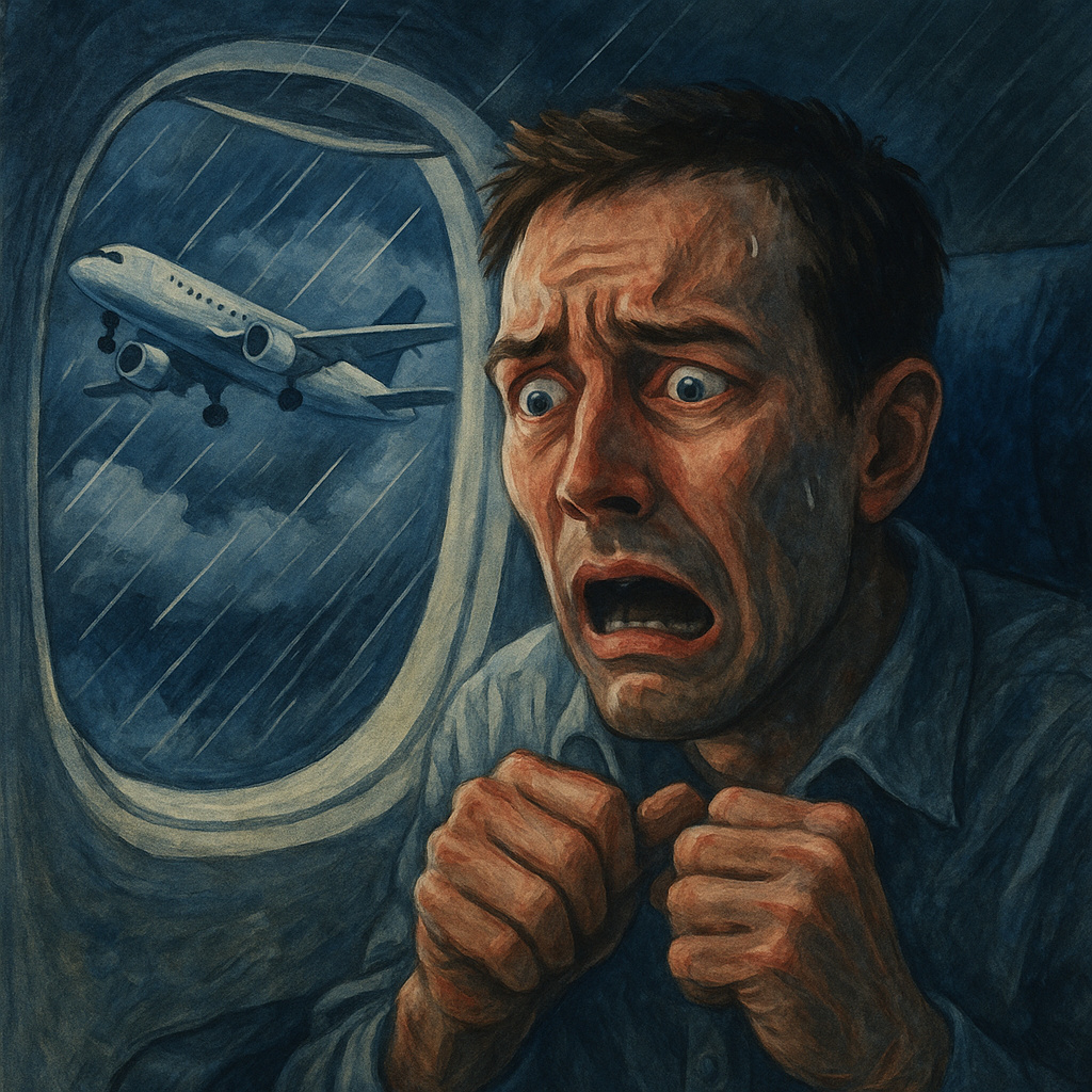 Самолет - это ситуация, где вы не контролируете происходящее. Не можете выйти, не можете остановиться, не можете сказать "стоп, передумал". Заперты в железной коробке на высоте 10 000 метров, и ваша жизнь зависит от пилотов, техники, погоды - от всего, кроме вас.