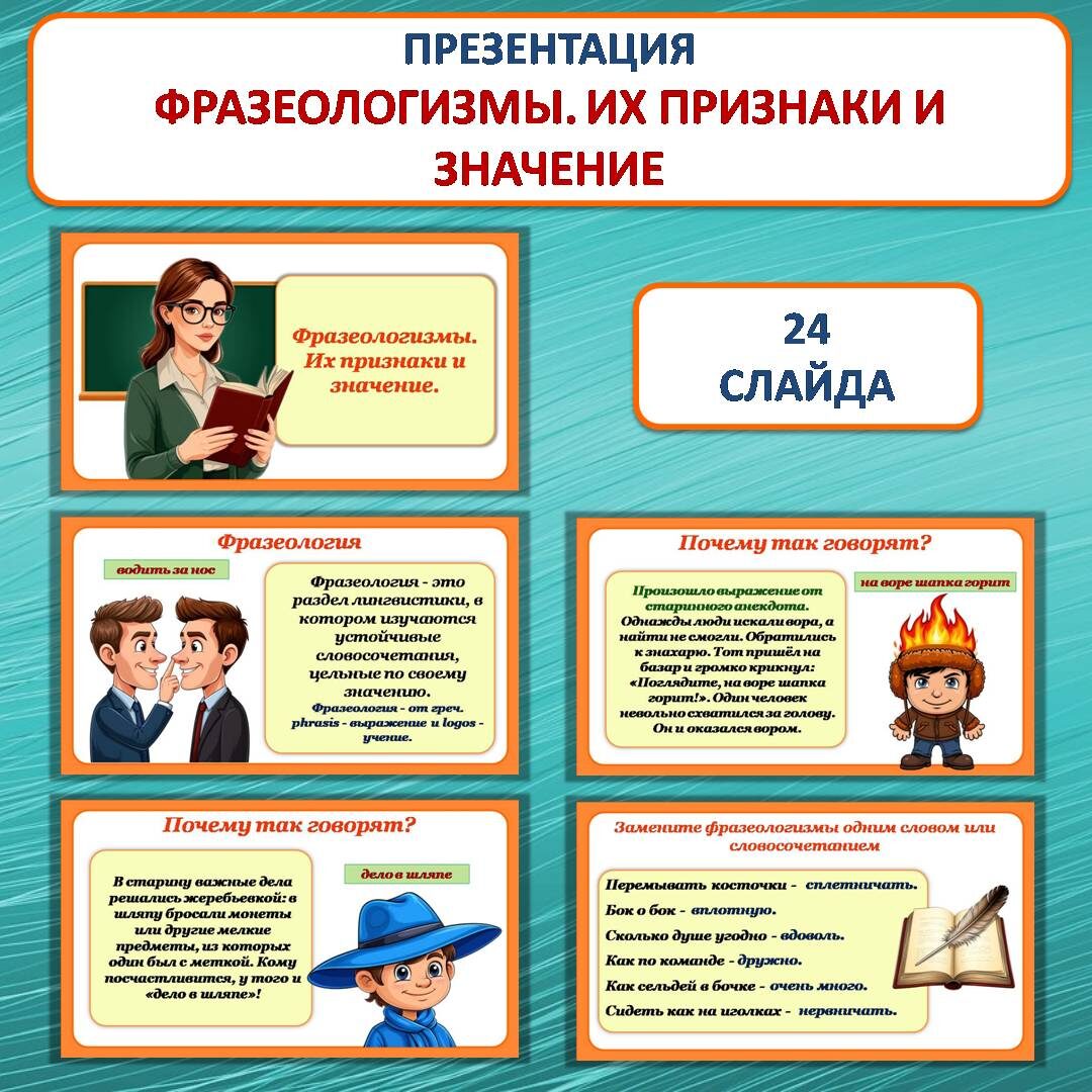 Презентацию скачать здесь В презентации 24 слайда. Слайды № 4-6, 17-23 анимированы, на этих слайдах представлены практические задания по изучаемой теме. Содержание презентации: Слайд № 1. Титульный слайд. Слайд № 2. Н.В. Гоголь о русском языке. Слайд № 3. Что такое фразеология. Слайды № 4-6. Подумаем вместе. Слайд №7. Что такое фразеологизмы. Слайд № 8. Свойства фразеологизмов. Слайд № 9. Фразеологическое богатство русского языка. Слайд № 10. Фразеологические словари. Слайды № 11-16. Почему так говорят. Слайды № 17-23. Практические задания. Слайд № 24. Роль фразеологизмов в русском языке. Данная презентация станет ценным помощником для учителя русского языка, обеспечит эффективное проведение урока и облегчит понимание сложной темы детям. Желаю успехов!