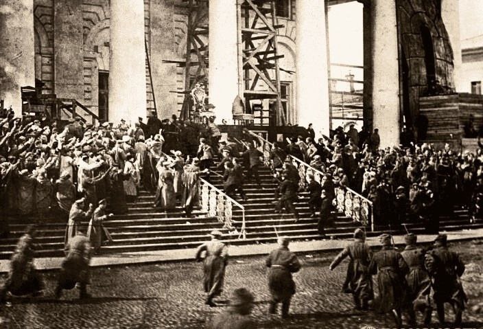 8 ноября 1920 года у Зимнего дворца было дано грандиозное массовое представление "Взятие Зимнего". По масштабности и зрелищности инсценировка "Взятие Зимнего дворца" не имела аналогов в истории России, да, пожалуй, и других стран. В постановке было использовано всё пространство Дворцовой площади (тогда площади Урицкого) и прилегающие к ней территории. Зрители располагались на площади, десятки прожекторов освещали место действия. Режиссёрский состав насчитывал несколько десятков человек, а в самой постановке принимали участие около восьми тысяч человек, в том числе сотни солдат и матросов, были привлечены военная техника и, естественно, крейсер "Аврора". Участники инсценировки трудились почти бесплатно - за продовольственный паёк. Пресса об этом писала с восторгом, как и о том, что постановка расходится с тем, что на самом деле случилось в стране три года назад. "В 17-ом пуль выпустили меньше, чем теперь". Мало-помалу взятие Зимнего из реального события стало превращаться в революци