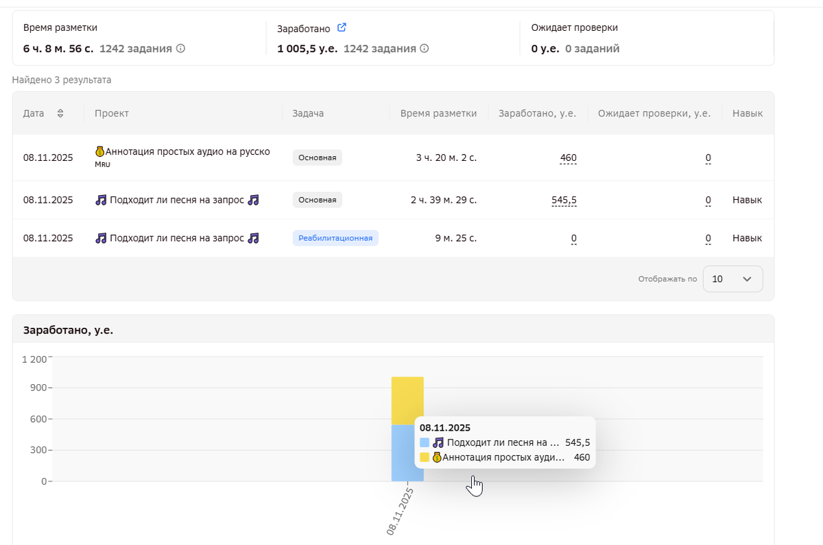 Наконец-то и на моей улице развалился грузовик с пряниками. Я смог вспомнить былые годы, когда за 1 день мой заработок в Интернете был больше 1 тысячи рублей (времена, когда Дзен платил). На этот раз, а именно, сегодня 8 ноября 2025 года, мне удалось заработать на площадке TagME 1005,5 рублей. Как вы можете увидеть на графике, на это у меня ушло 6 часов 8 минут и 56 секунд. Благо, сегодня выходной день и можно вовсю посвятить себя своему хобби - заработку в Интернете. Откровенно повезло с заданиями. Было очень много моих любимых "подходит ли песня на запрос", которые стоят по 50 копеек, а выполняется за 10 секунд, как правило. Ну и, наконец-то, появились задания "аннотация простых аудио" по 10 рублей за задание. В этот раз необходимо расшифровывать лекции по ЕГЭ. Особенность таких площадок в том, что иногда там пусто, а иногда прям густо-густо. Например, за 1 день я заработал на этой больше, чем за весь октябрь. Теперь главное, чтобы задания не заканчивались дольше))
