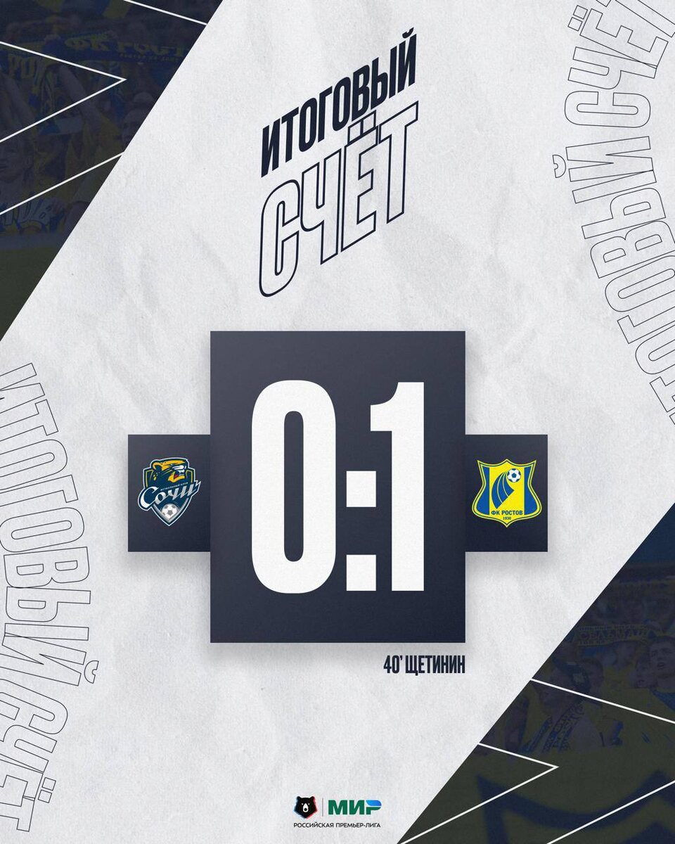 В ответ на пост ФК «Ростов» обыграл в гостях «Сочи» Футбольный клуб «Ростов» в гостях обыграл «Сочи» в матче 15-го тура Мир РПЛ. Матч завершился со счетом 0:1. Единственный гол за игру на 40-й минуте забил полузащитник «Ростова» Кирилл Щетинин.