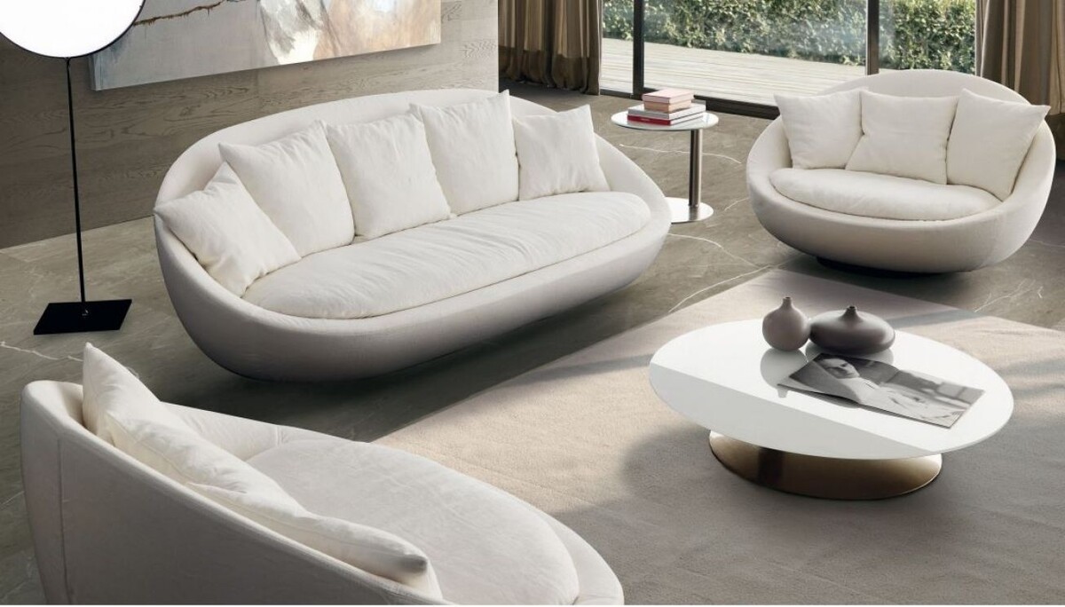 Тканевые материалы — микровелюр, букле, шенилл, флок — подчёркивают плавность линий и усиливают эффект мягкости. Это делает округлую мебель не только эстетически выразительной, но и приятной на ощупь.