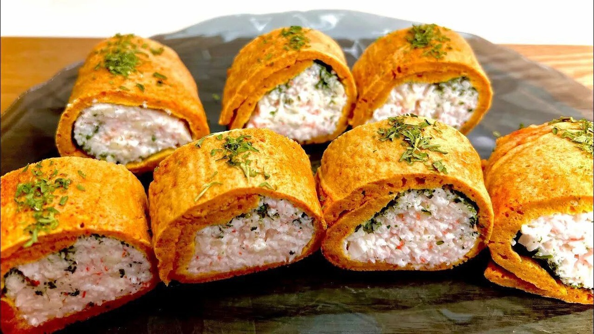 Яичные роллы с крабовыми палочками – это прекрасный вариант разнообразить утреннее меню, если простая яичница порядком поднадоела. По вкусу они превосходят обычный омлет, предлагая новую палитру ощущений. Для приготовления потребуются следующие ингредиенты: - три куриных яйца, - четыре-пять крабовых палочек, - две столовые ложки майонеза или мягкого сыра, - одна столовая ложка пшеничной муки, - соль, - свежая зелень, -растительное масло для жарки. Яйца необходимо взбить до однородной консистенции с добавлением соли и муки – смесь должна получиться жидкой, как для выпечки тонких блинчиков. На разогретой сковороде с небольшим количеством масла испеките два тонких блинчика из яичной смеси с обеих сторон. Для начинки крабовые палочки натрите на мелкой терке, соедините с майонезом и измельченной зеленью. Получившиеся яичные блины равномерно распределите начинкой из крабовой массы и аккуратно скрутите в плотные рулеты. Дайте им немного настояться в течение 5-7 минут, чтобы они про