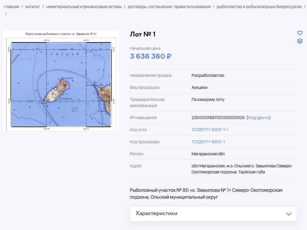Охотское территориальное управление Росрыболовства объявило электронный аукцион на право использования трех рыболовных участков, расположенных в прибрежной зоне Магаданской области. Эти участки предназначены для организации любительского рыболовства. Подача заявок заинтересованными лицами возможна до 18 ноября. Сам аукцион запланирован на 24 ноября. На торги выставлены следующие участки: — Участок в районе острова Завьялова со стартовой ценой 3,6 миллиона рублей (https://clck.ru/3QAp8B); — Участок в районе залива Пёстрая Дресва с начальной ценой около 3,5 миллиона рублей (https://clck.ru/3QAp8E); — Участок в районе устья реки Таватум стоимостью приблизительно 2,4 миллиона рублей (https://clck.ru/3QAp8F). Перечень разрешенных к вылову водных биоресурсов включает анадромные виды рыб.