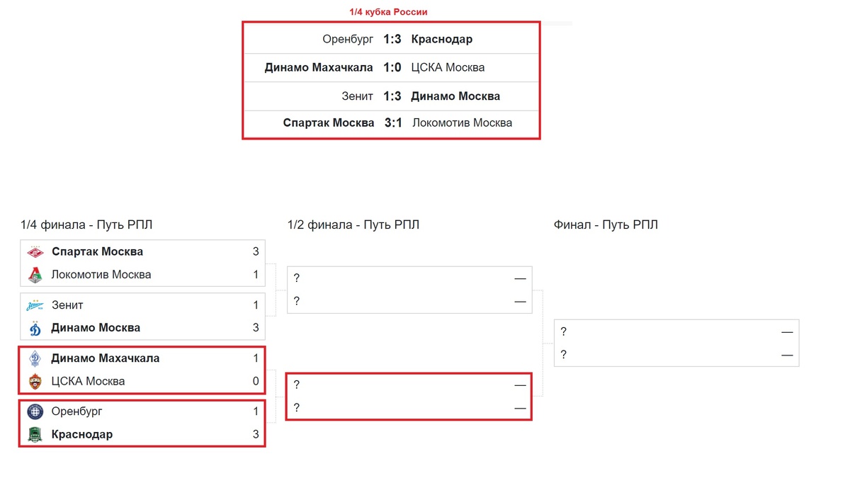 Привет самые славные и самые преданные подписчики! 8 ноября 2016 года мною был опубликован первый ролик на ютубе. С тех пор ровно вот уже 9 лет канал «Алекс Спортивный» выходит в эфир и радует вас новыми выпусками. Желаю вам всем здоровья, мирного неба, а новости пусть будут только спортивные! Сегодня я расскажу о первых матчах 1/4 Кубка России и 4-х субботних матчах РПЛ. Кубок России: · Оренбург – Краснодар 1:3. · Динамо (Махачкала) – ЦСКА 1:0. · Зенит – Динамо (Москва) 1:3. · Спартак – Локомотив 3:1. Смотрим сетку плей-офф: Если Спартак по сумме двух матчей пройдёт Локомотив, то в полуфинале встретится с победителем пары Зенит – Динамо (Москва). Во втором полуфинале встретятся победитель пары Динамо (Махачкала) – ЦСКА и победитель пары Оренбург – Краснодар. Переходим к субботним результатам чемпионата России: ---------------------------------- «Динамо» (Москва) уступило «Акрону». Пестряков и Лончар во втором тайме сделали результат в пользу Акрона, за который вторую игру пропускал к