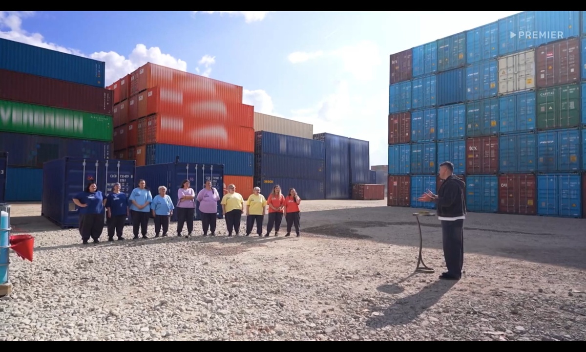 Участниц привезли на испытание, необходимо залезть на пирамиду из гаражей и нести при этом ведро-конус с водой, которое течет и поставить его нельзя, а заполнить колбы, которые стоят на вершине как то надо.