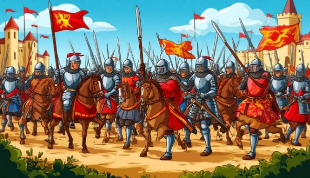 Лишь на себя самого рыцарь полагался в поединке один на один. Однако в большом сражении рыцари действовали единой силой, взаимодействуя друг с другом. Поэтому, разумеется, существовала и особая тактика ведения общего боя, причем она оставалась почти неизменной на протяжении многих веков. Теперь, с высоты нашего времени, легко судить о ее примитивности и однообразии, упрекая рыцарей в нарушении элементарной дисциплины, в полном презрении к пехоте. Однако именно рыцари решали исход любого сражения. Что могла противопоставить пехота, пусть и многочисленная, отряду закованных в броню воинов- профессионалов, все сметающих на своем пути? Когда же принципы ведения боя стали меняться, рыцарству пришлось уйти. Не только с полей сражений, но и со сцены истории. Войско собиралось так: каждый из рыцарей приводил под знамена своего сеньора нескольких оруженосцев, которые во время битвы оставались позади боевой линии, держа наготове нескольких лошадей и запасное вооружение. Кроме того рыцаря сопрово
