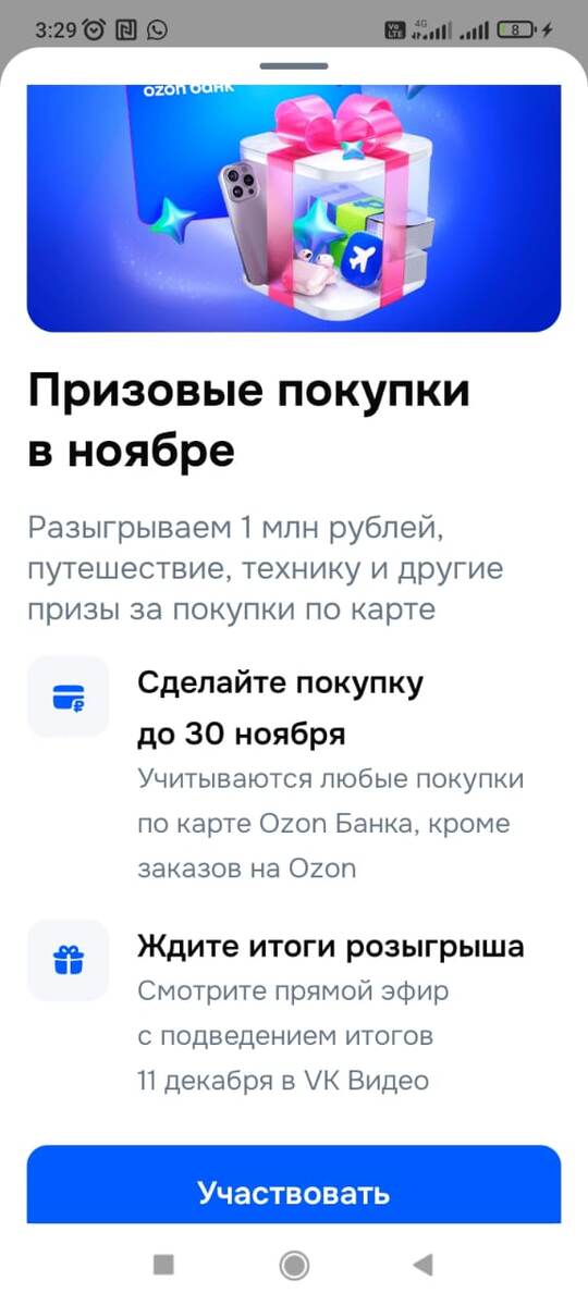 Три банка, которыми я пользуюсь особенно активно, в ноябре прямо порадовали и не только кэшбэком. Рассказываю… 🛒В Озон Банке можно поучаствовать в розыгрыше 1 миллиона рублей, просто делая покупки за пределами Озона До 30 ноября покупайте на сумму от 500 рублей в магазинах, кафе, да даже на АЗС тоже можно, и получайте билетики (условные, виртуальные) на розыгрыш миллиона. Кроме миллиона будут разыгрываться путешествия и призы, бытовая техника и всякое такое. На общую сумму 30 миллионов рублей! Розыгрыш пройдет 11 декабря и будет транслироваться в ВК Видео. Я специального ничего не делаю, просто оплачиваю покупки, например, сделала 2 заказа в Яндекс Лавке — еще бы, с кэшбэком 20% почему бы и не заказать? 🏦В Альфа-банке до конца ноября можно получить кэшбэк 100% на покупку во Вкусноточке, через приложение с доставкой. Правда, максимум 600 рублей, но все равно это неплохо. Поскольку мы фастфуд едим, есть такой грех, и даже едим с удовольствием, то обязательно эту возможность сэкономить