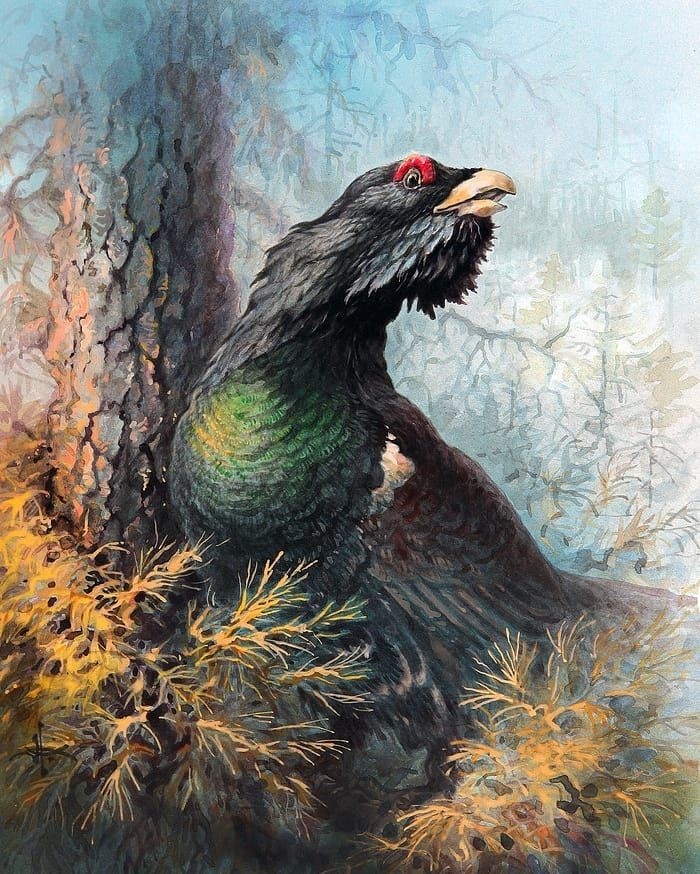 солнце садится в соснах токует глухарь тоненький месяц •••| ••• ночь наступила для глухаря нет преград птица беспечна бой впереди до конца это природы закон •••| ••• солнце восходит дятла чеканная дробь ток завершает •••| ••• в шишках сосновых кочки покрытые мхом перья и ветки для настоящих мужчин зрелища было сполна •••| ••• _ " Глухарь..." Художник Александр Дегтев _ © Copyright: Лю Ко (Эли Селини) #хокку #Лю_Ко #глухарь, #живопись