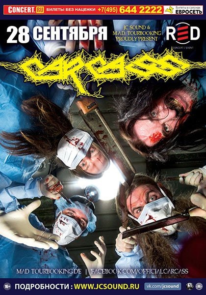 28 сентября 2017 года в московском клубе **RED** состоялся второй в истории визит легендарной британской группы Carcass — пионеров жанра горграйнд и одних из самых влиятельных фигур экстремального метала. Предыстория и ожидания. Последний раз Carcass приезжали в Россию в 2013 году в рамках тура в поддержку альбома *Surgical Steel* — первого за 17 лет. Возвращение группы после долгого перерыва стало событием для мировой метал‑сцены, а новый альбом получил восторженные отзывы критиков и фанатов. К 2017 году состав группы выглядел так: * Джефф Уокер (вокал, бас‑гитара) — один из основателей и неизменный фронтмен; * Билл Стир (гитара, вокал) — гитарист‑виртуоз, участник первых альбомов Napalm Death; * Бен Эш (гитара) — присоединился к группе после реюниона; * Даниэль Уилдинг (ударные) — новый барабанщик, привнёсший энергию и технику. Ход концерта. Концерт начался ровно в 20:30 — редкий пример пунктуальности для московских метал‑мероприятий. Несмотря на проблемы с метро (сбой на Серпухов