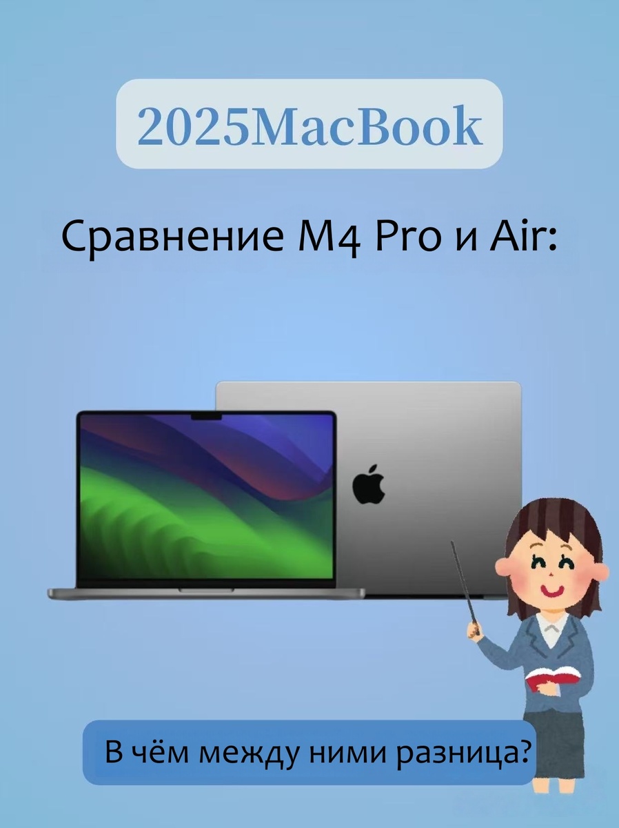 Разница между MacBook Air и Pro: на примере чипа M4 💻 Новые ноутбуки Apple с чипом M4 вызвали настоящий бум! Как выбрать между Air и Pro? Как фанат MacBook, я подготовил это сравнение, чтобы помочь вам найти идеальную модель! 😊 1️⃣ Дизайн: Легкость vs Профессионализм MacBook Air: Вес всего 1.24 кг, толщина 11.5 мм ✨ · Новый небесно-голубой цвет свежий и стильный · Ультрапортативный и эстетичный · Классический тёмно-серый цвет убран 😢 MacBook Pro: Вес около 2 кг (16-дюймовая версия) · Более массивный корпус, но богаче набор портов (HDMI, слот SD-карты и др.) · Дизайн для профессиональных сценариев · Идеален для стационарной работы с периферией 🏢 2️⃣ Производительность: Повседневная vs Профессиональная Преимущества Air: Чип M4 + 16 ГБ ОЗУ в базе · Плавная многозадачность 🚀 · Поддержка двух внешних мониторов (вау-апгрейд!) · Отлично справляется с офисными задачами и веб-сёрфингом · Отличный контроль температуры при обычном использовании · Но: возможное снижение производительности пр